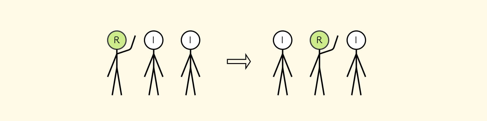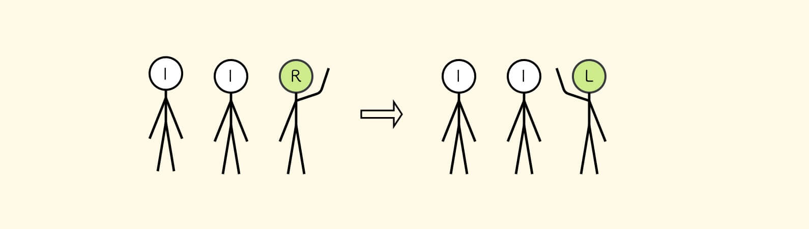 同理对于左手的情况,会向左一路传到队头,换举右手,不再赘述。