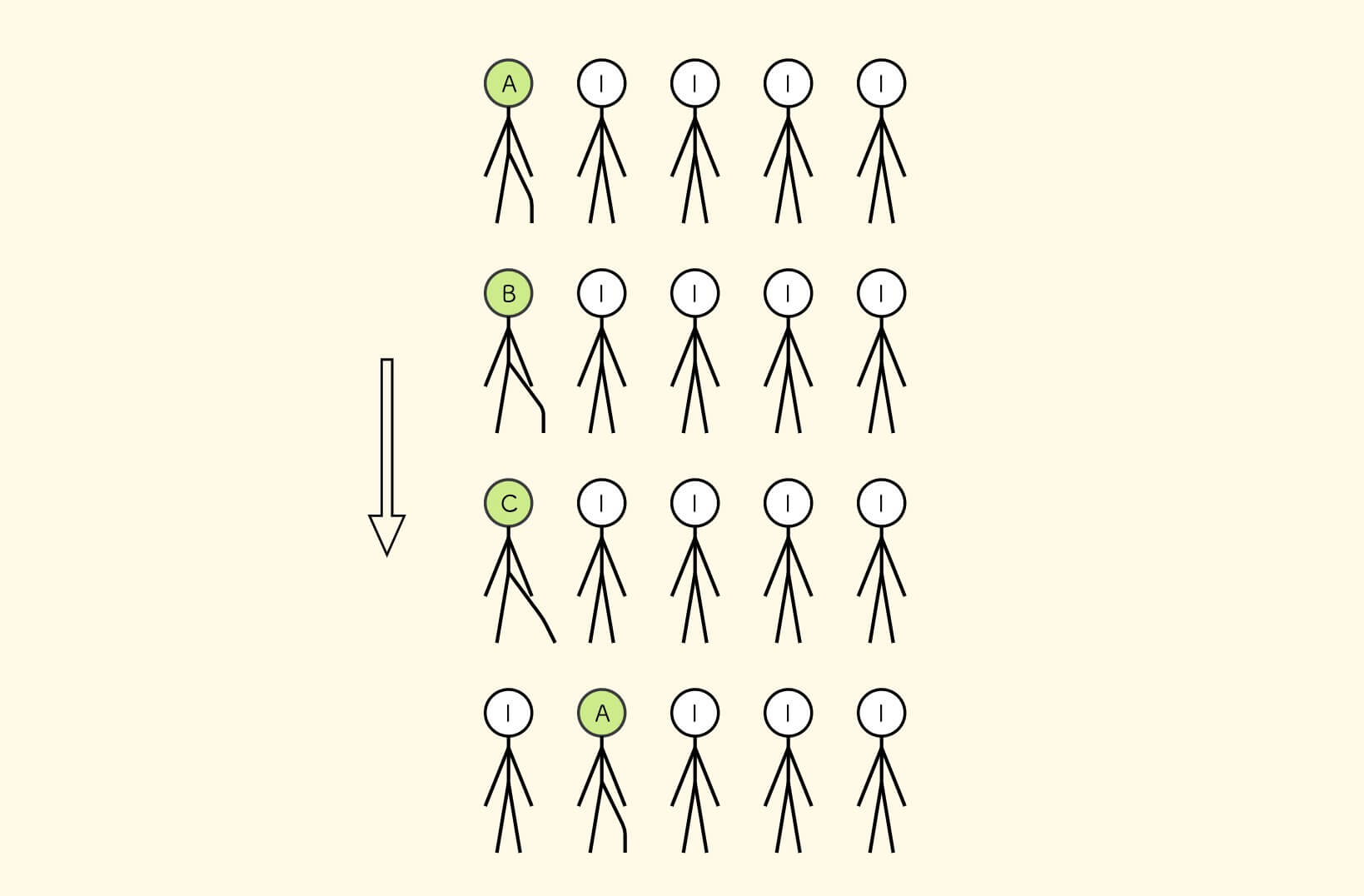 在最开始的阶段,和前面 8 个士兵的情况差不多,不同的是,这一次是 A