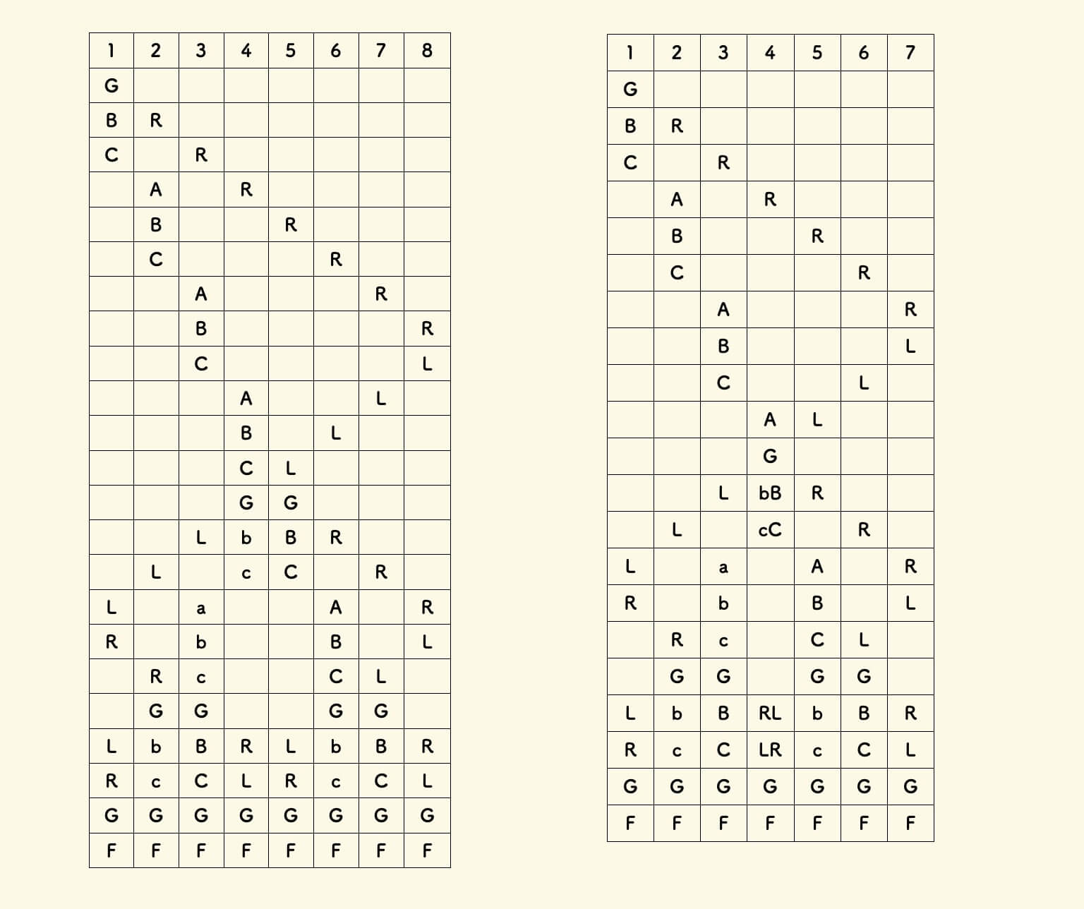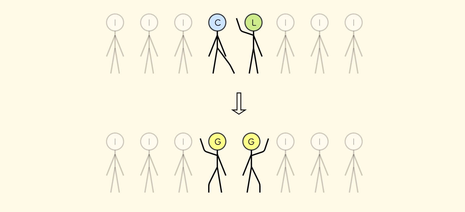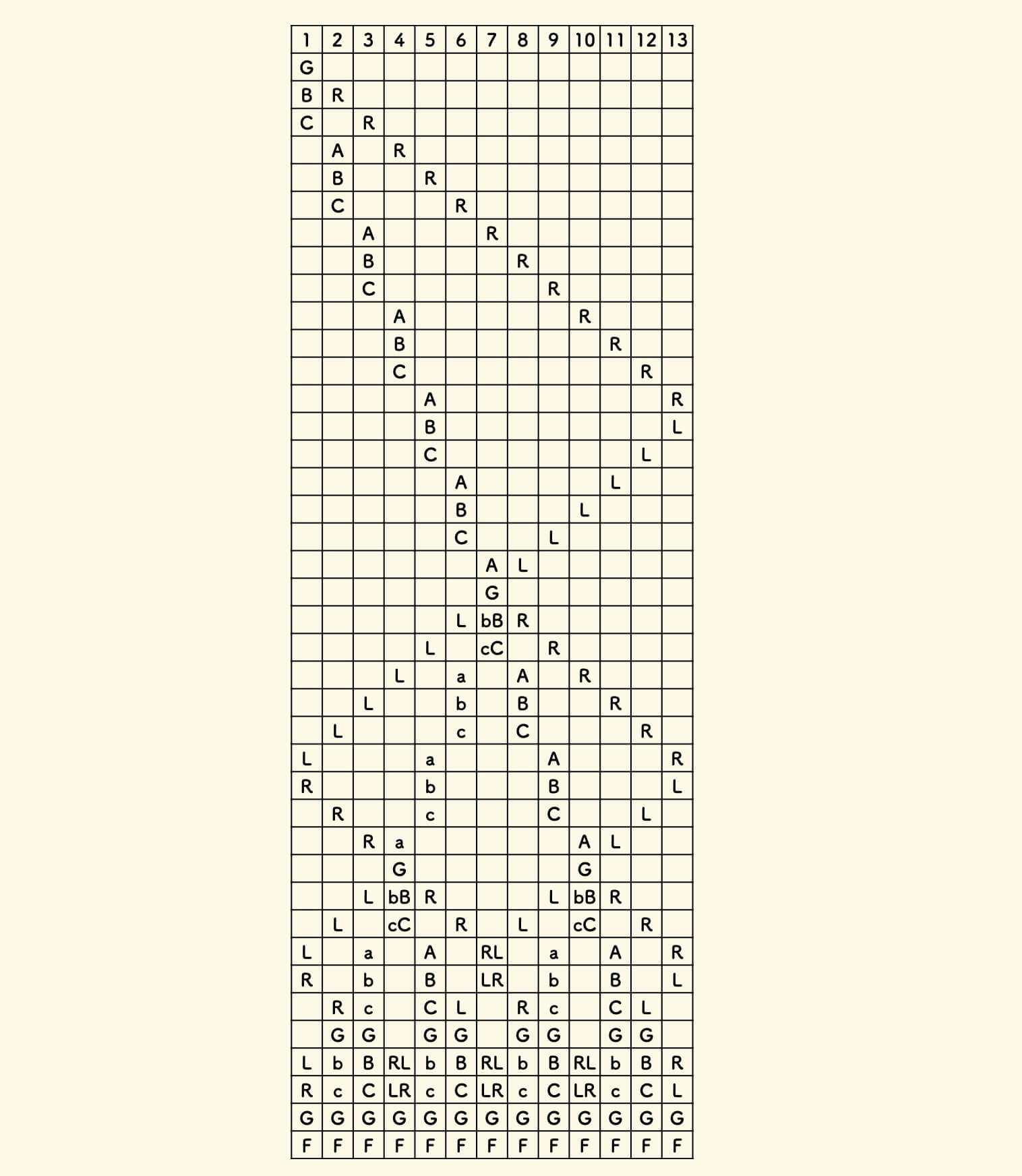 这是一幅很长的图,可以看到,由于举手比迈腿的传播快三倍,举手的动作传播到队尾后, 又反射回来,正好和迈腿动作在队列中点相遇。 此时,我们让这两个士兵都成为将军,进入 G