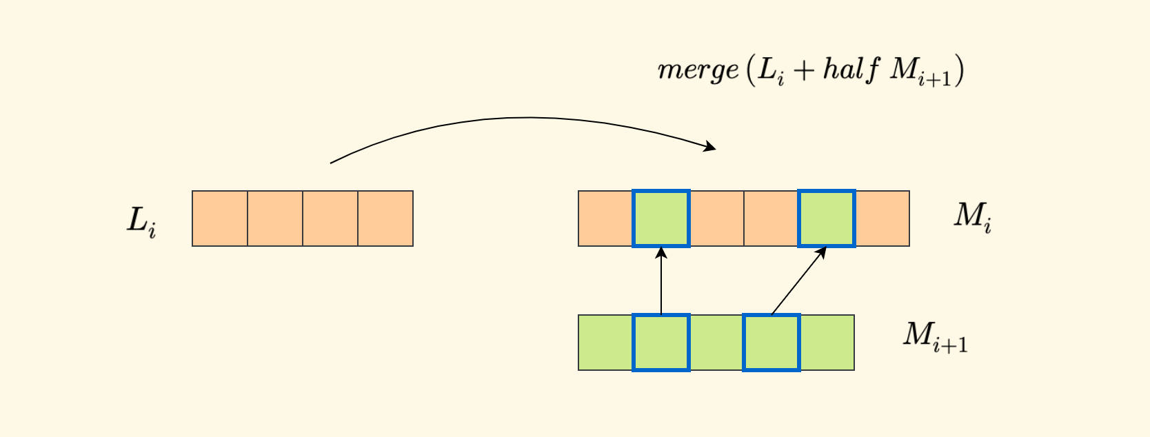 - 然后,对于 $i < k$ 的情况,从位置 $2$ 开始,对 $M_{i+1}$ 间隔采样,再和 $L_i$ 归并,合并过程和归并排序是一样的。
