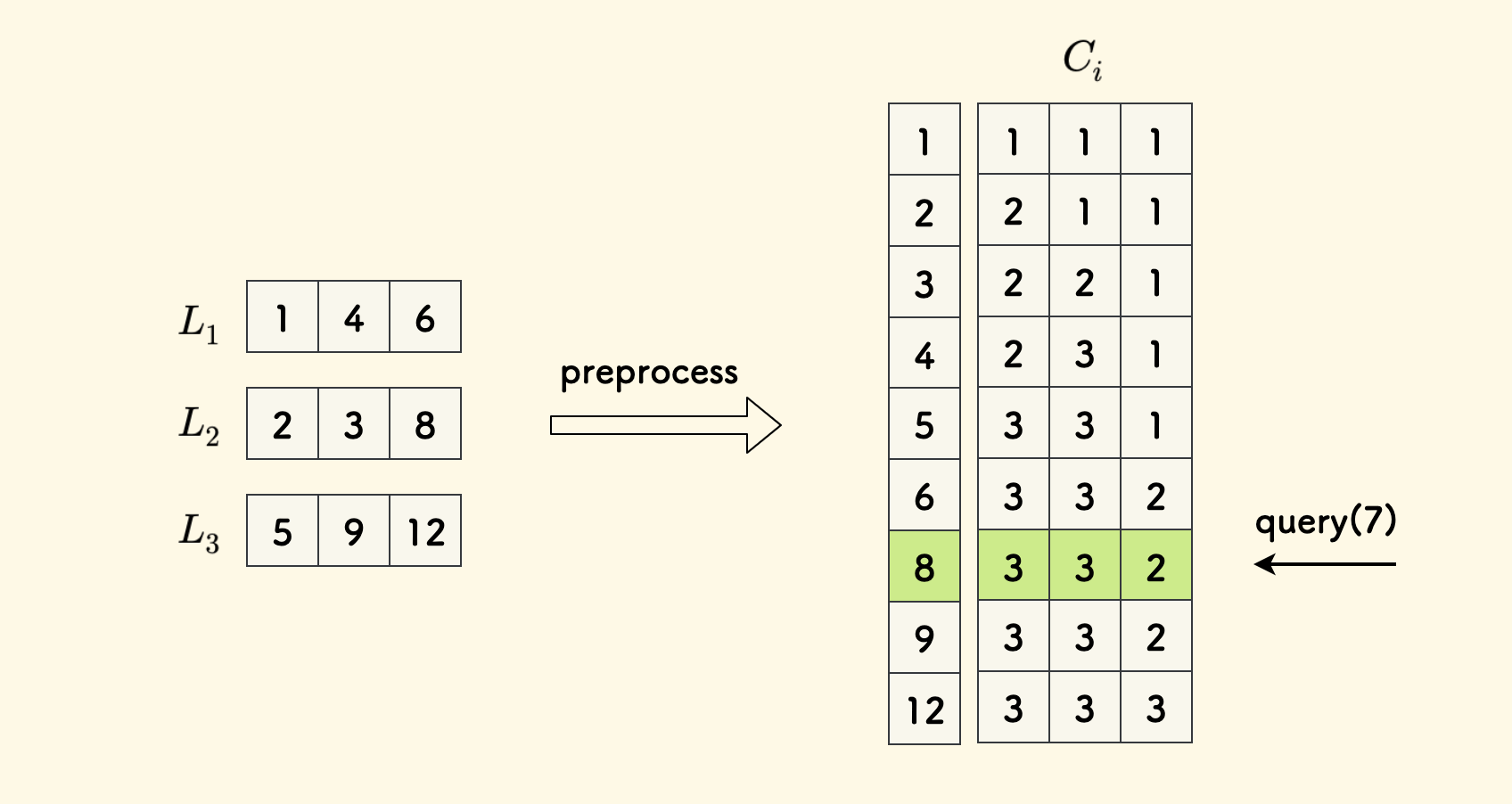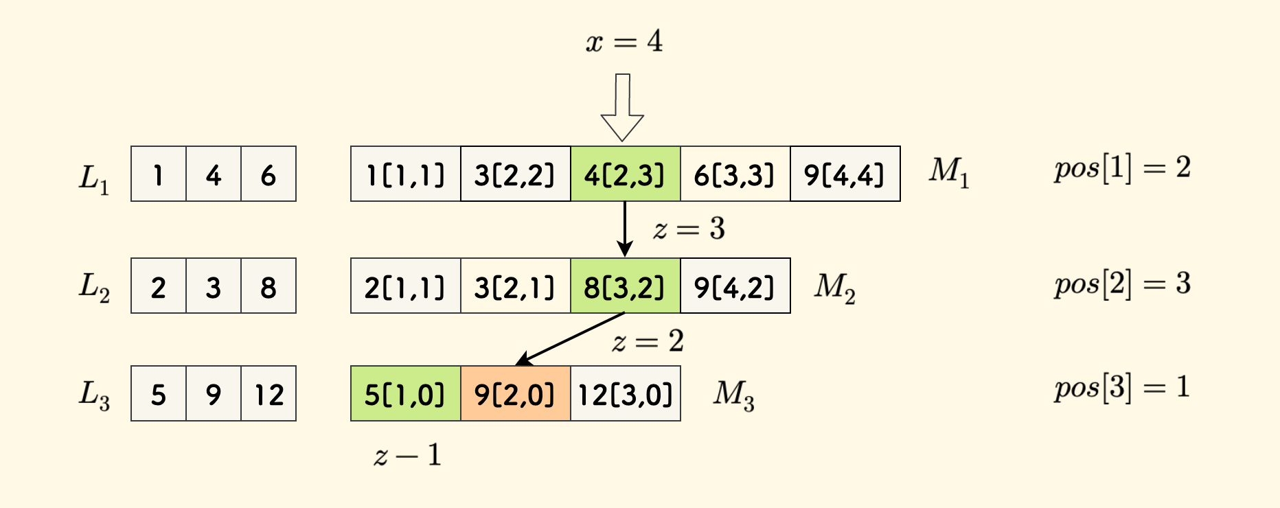 另一种思路是,先预处理一下,把这些数组归并成一个大的有序数组,然后其中每一项再存一个长度为 $k$ 的数组 $C$, 其中 $C_i$ 表示这个元素在原数组 $L_i$ 中的后继位置。