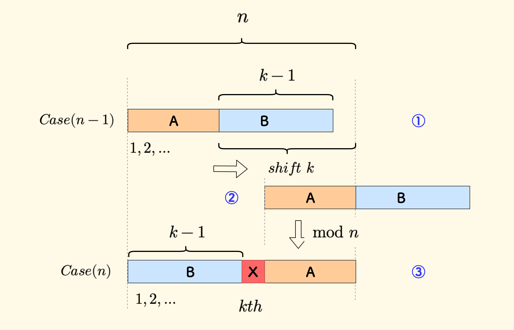 反向思考,已知 $n-1$ 规模的答案,把剔除的数字放回来,得到 $n$ 规模的情况。