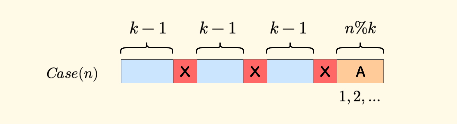 - $k = 1$ 时,除数 $k-1$ 变成 $0$ 失效,此时答案可特判为 $n-1$,相当于依次删除,最后一个数字一定是最终幸存者。