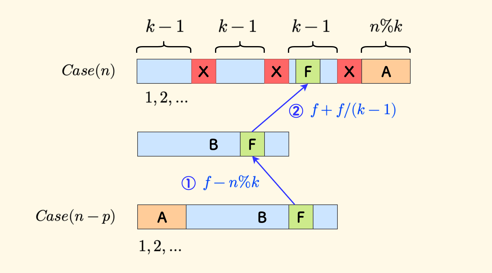因此,从 $f_k(n-1)$ 反推到 $f_k(n)$ 的时候,每个数字的变化可以描述为下式,最后幸存的数字亦是如此: