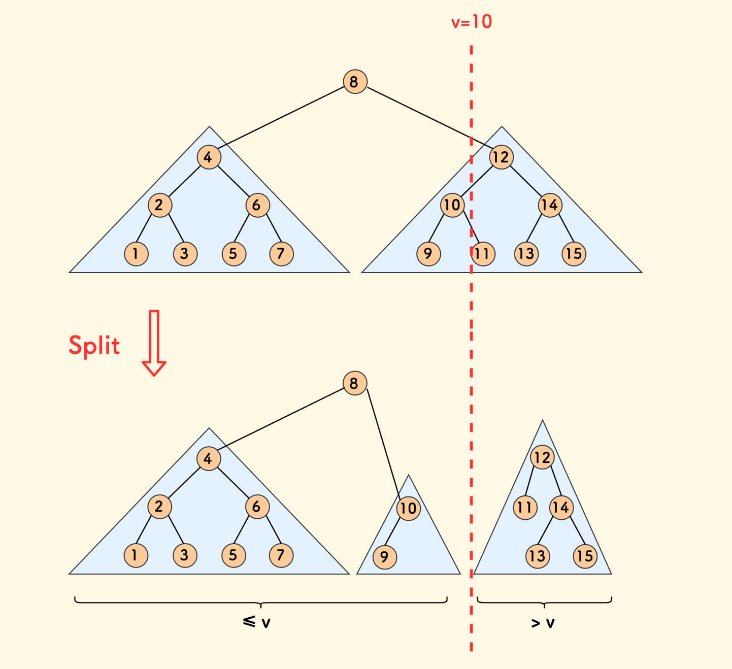 // 分裂后 x 的所有权值都 <= v,y 的所有权值都 > v