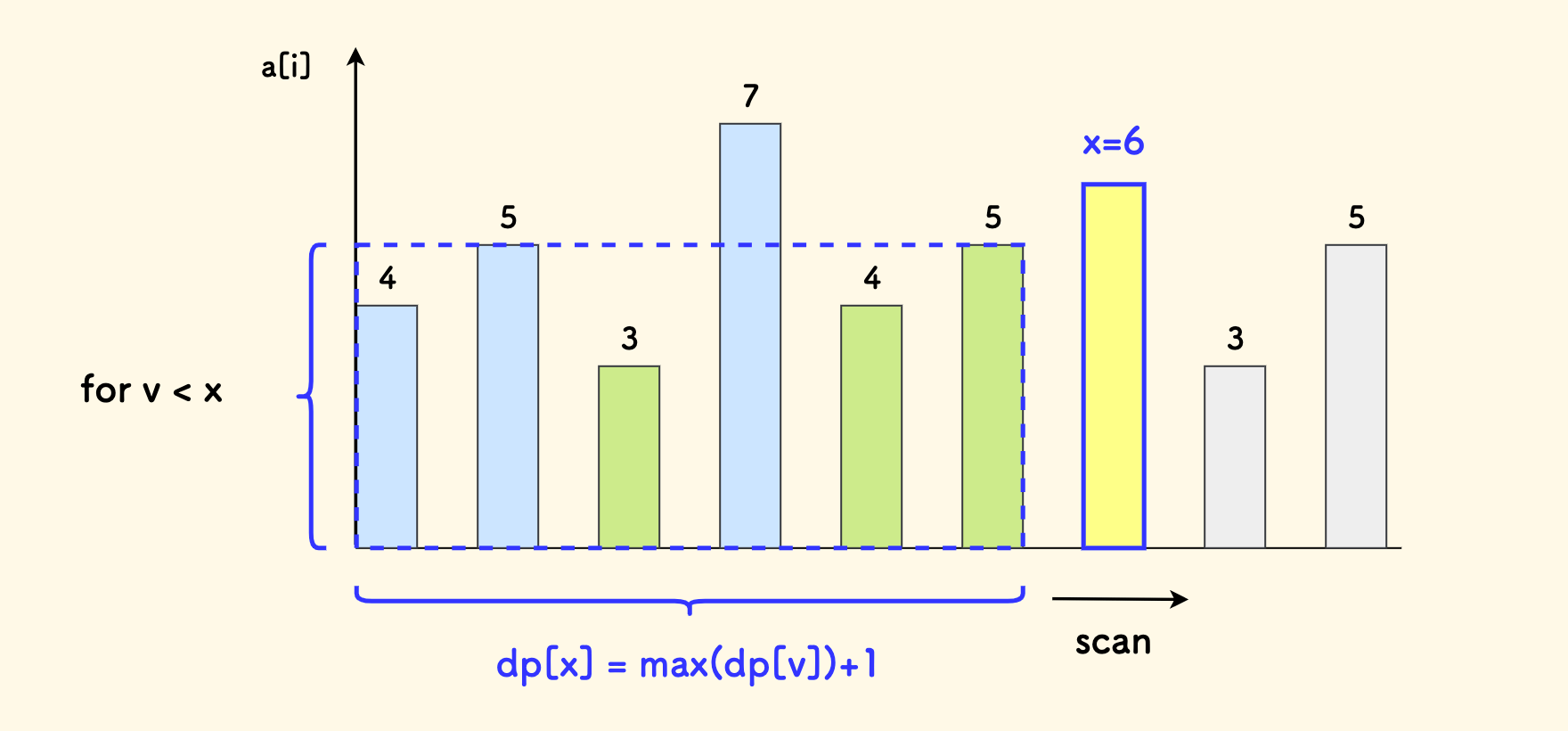 朴素的 DP 思路 (其分析可以参考 LIS DP 解法),伪代码如下。 可以看到目前的动态规划转移时间是 $O(n)$,接下来的思路都是在优化这个 DP 转移。