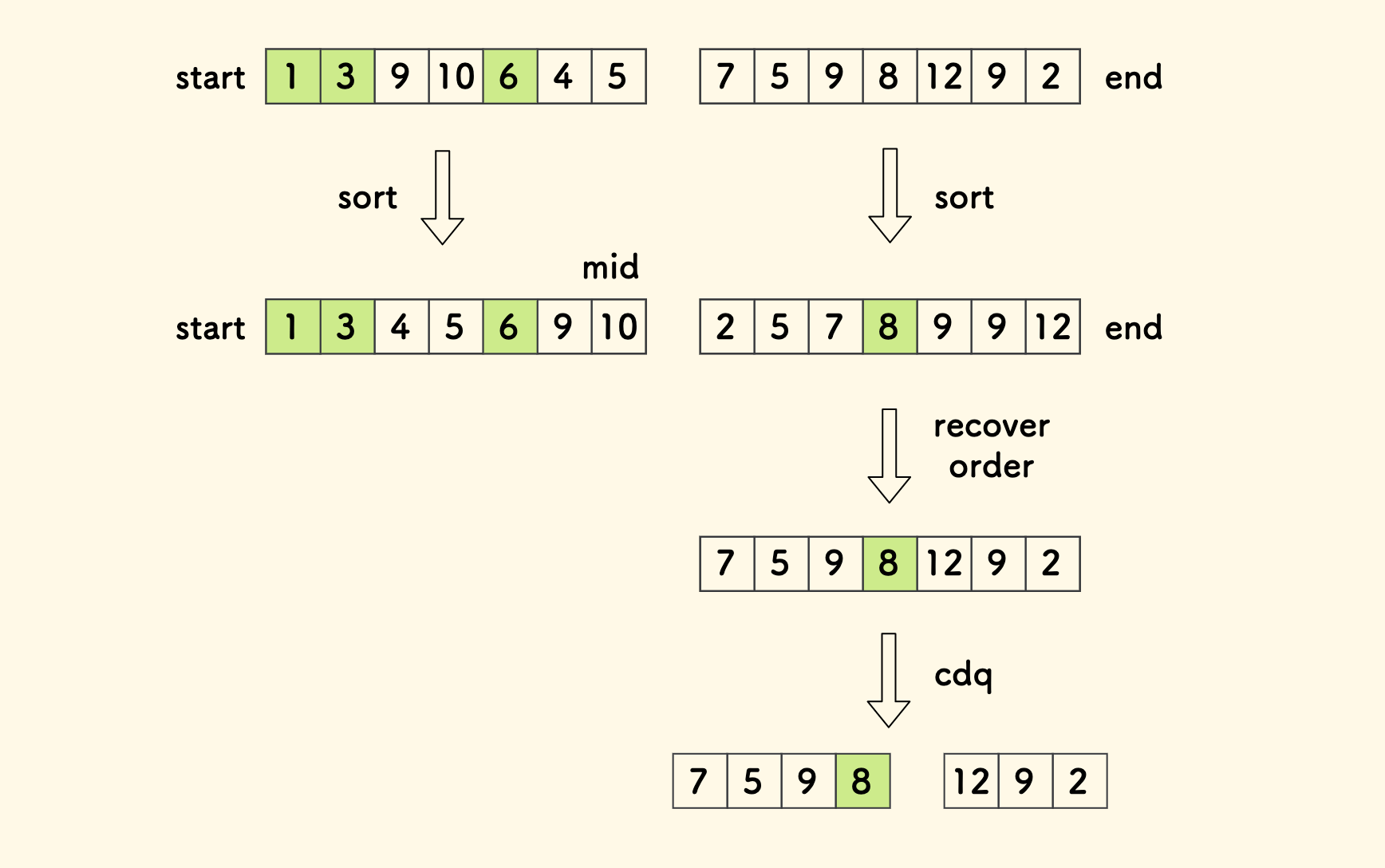 再处理右边之前,要提前恢复右边的顺序,因为 LIS 问题是按原顺序而言的, 我们事先排序只是为了计算左边对右边的贡献。恢复顺序可以考虑按下标重新排序。