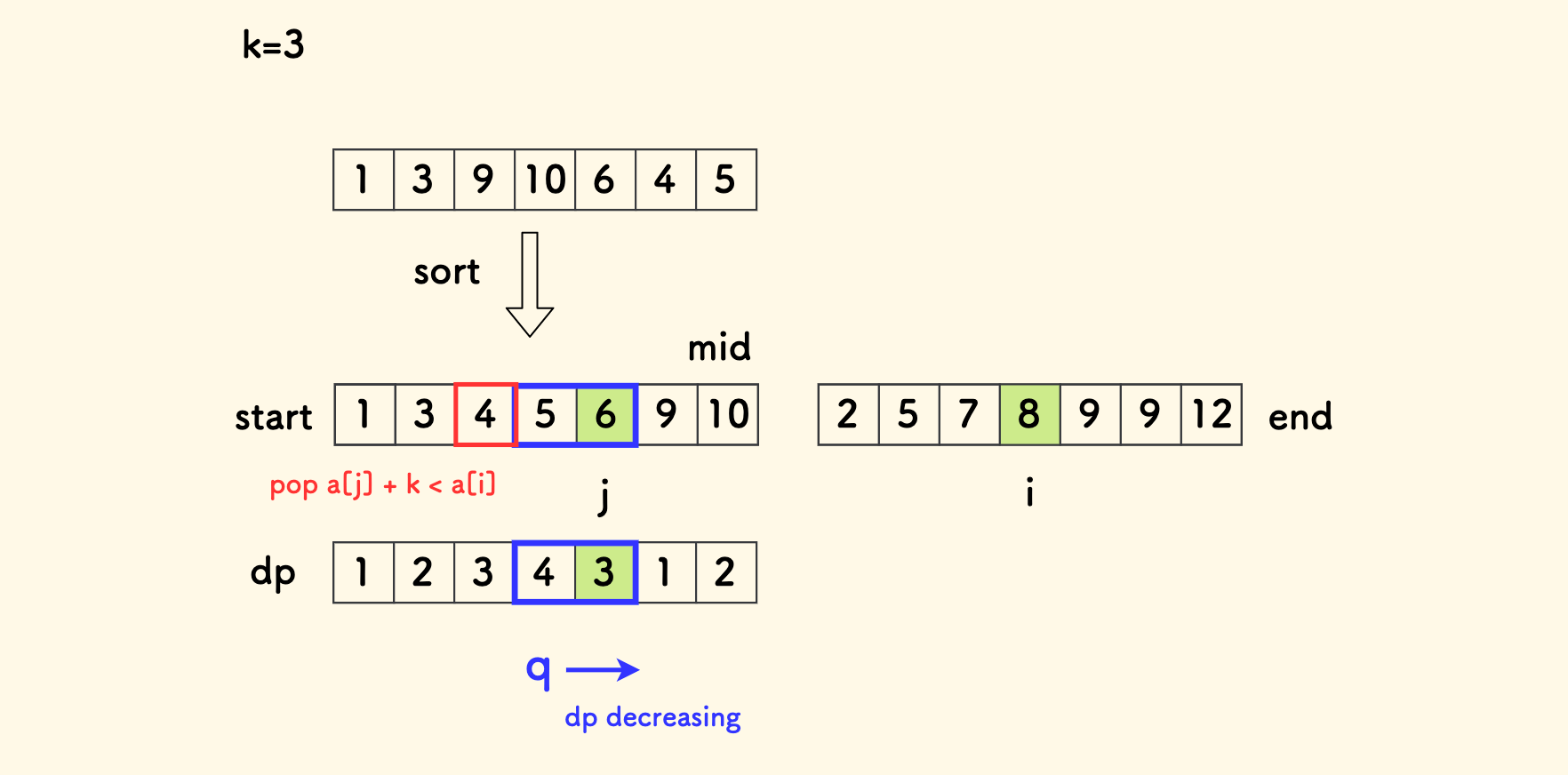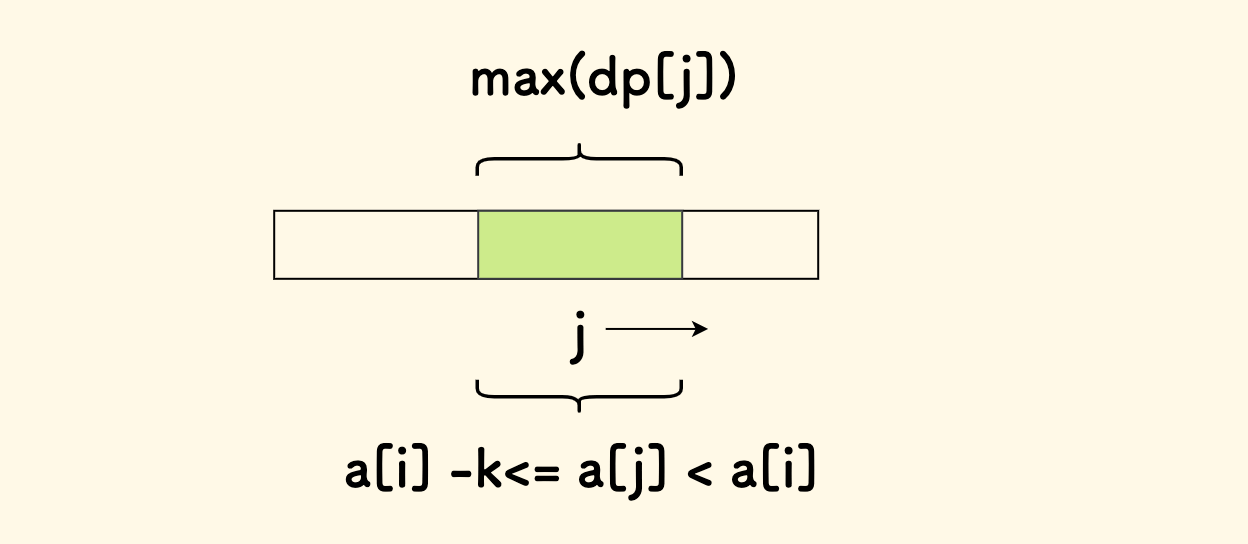 即可, 现在要加一个限定,就是要同时满足 a[i] - a[j] <= k
