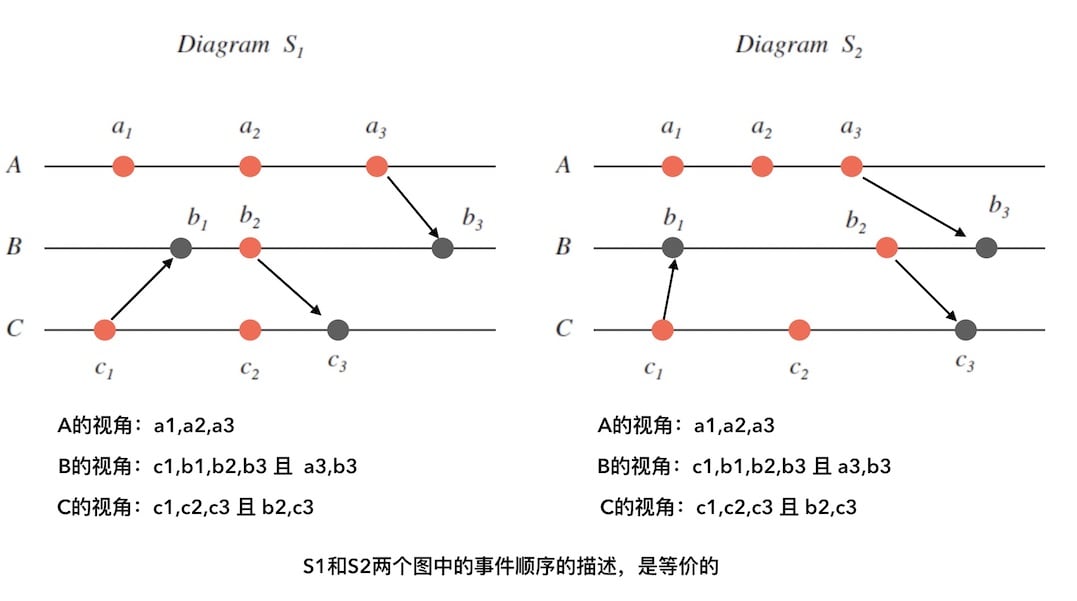 我们试着从每个进程的视角,依次对图$S_{1}$和$S_{2}$进行推导一下,会发现, 其实两个图所描述的事件顺序,在进程的相对视角中,是一样的。