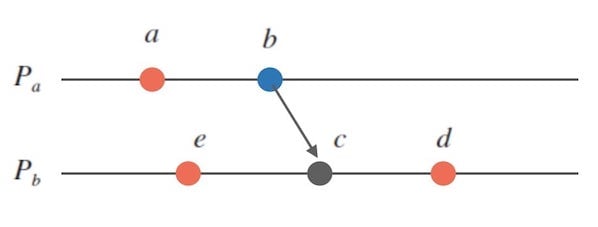 - 如果事件 $a$ 是「发送了一个消息」,而事件 $b$ 是接收了这个消息,则 $a \rightarrow b$。