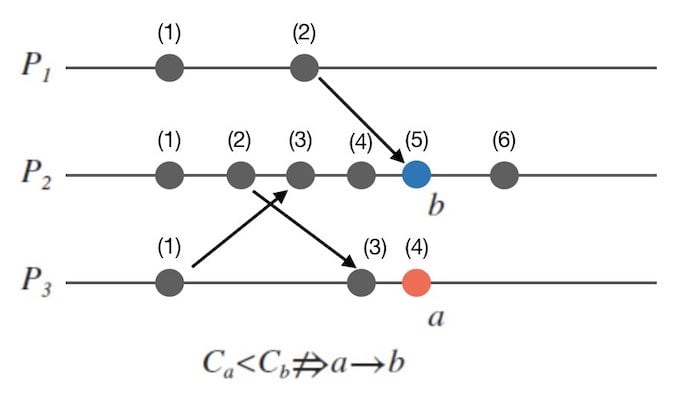 - 但是由于无法确定的网络延迟原因,导致进程A发出的消息到达C晚于进程B发出的消息到达C,这样 进程C的视角上,最终看到的事件顺序是 $b, a$,但是这与事实是相悖的。