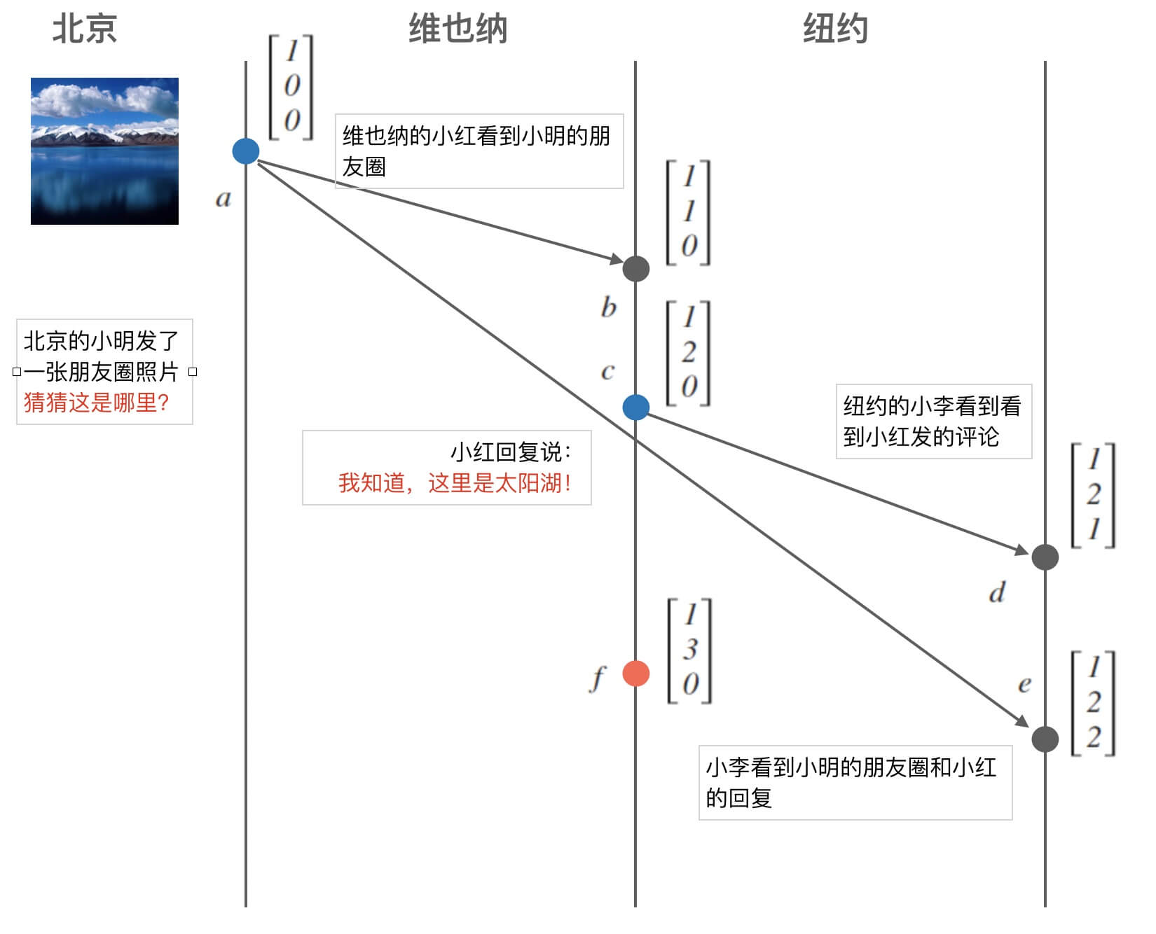在小李看到小明的朋友圈和小红的评论的时候,也收到了这两条数据的向量, 我们可以根据向量时钟来确定事件的先后关系,从而不会显示出因果矛盾。