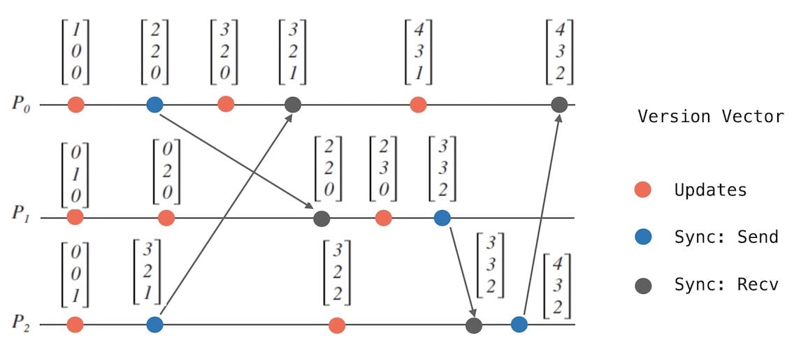 我们注意到在向量时钟算法中, 消息传播后,发送方的向量一定会小于接收者的向量, 是因为接收者对齐了发送者的原因。