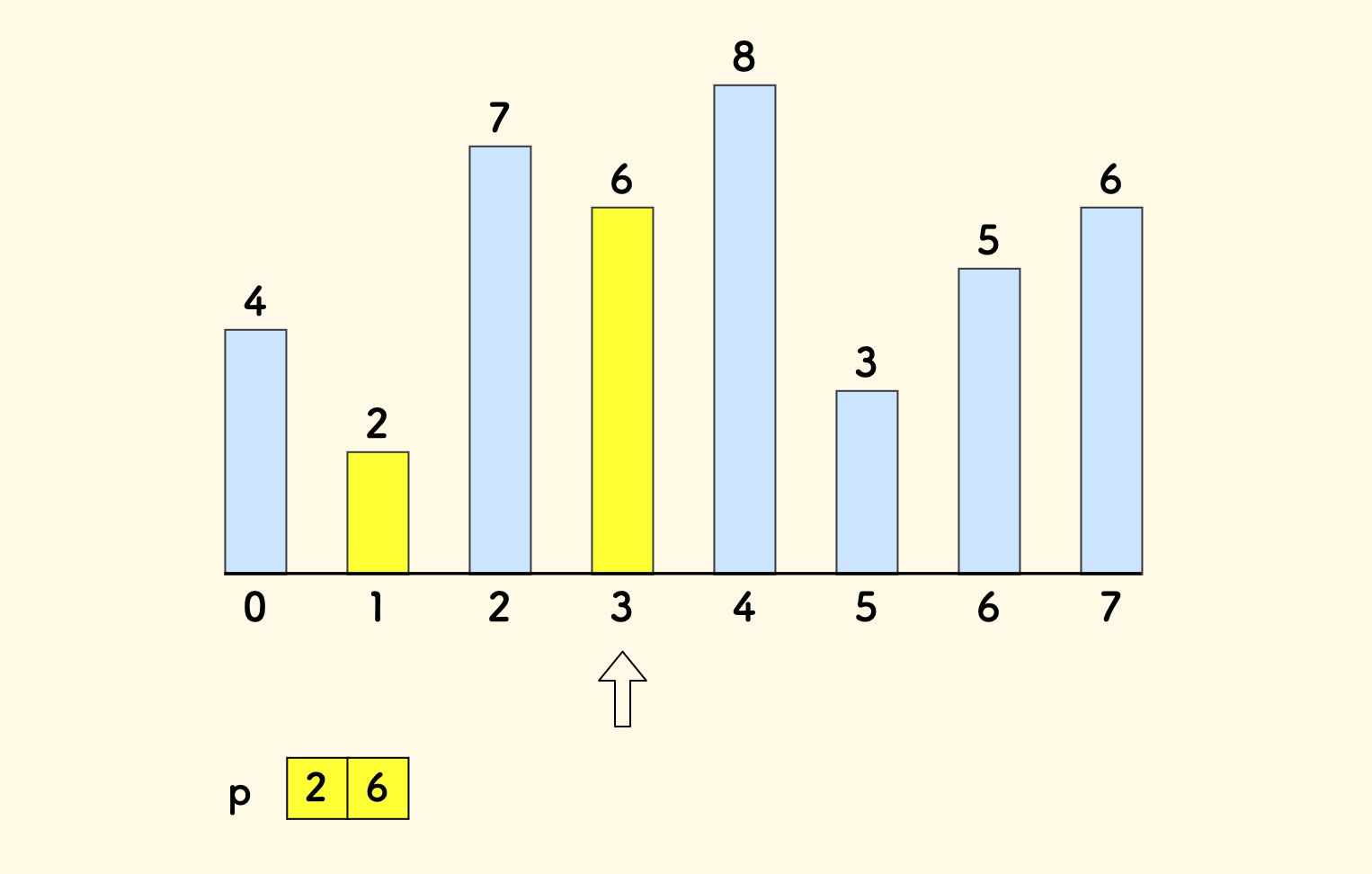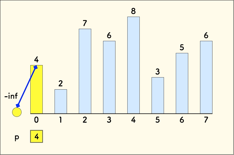 数组是严格递增的。数组 p 遇到更小的元素需要更新的说明
