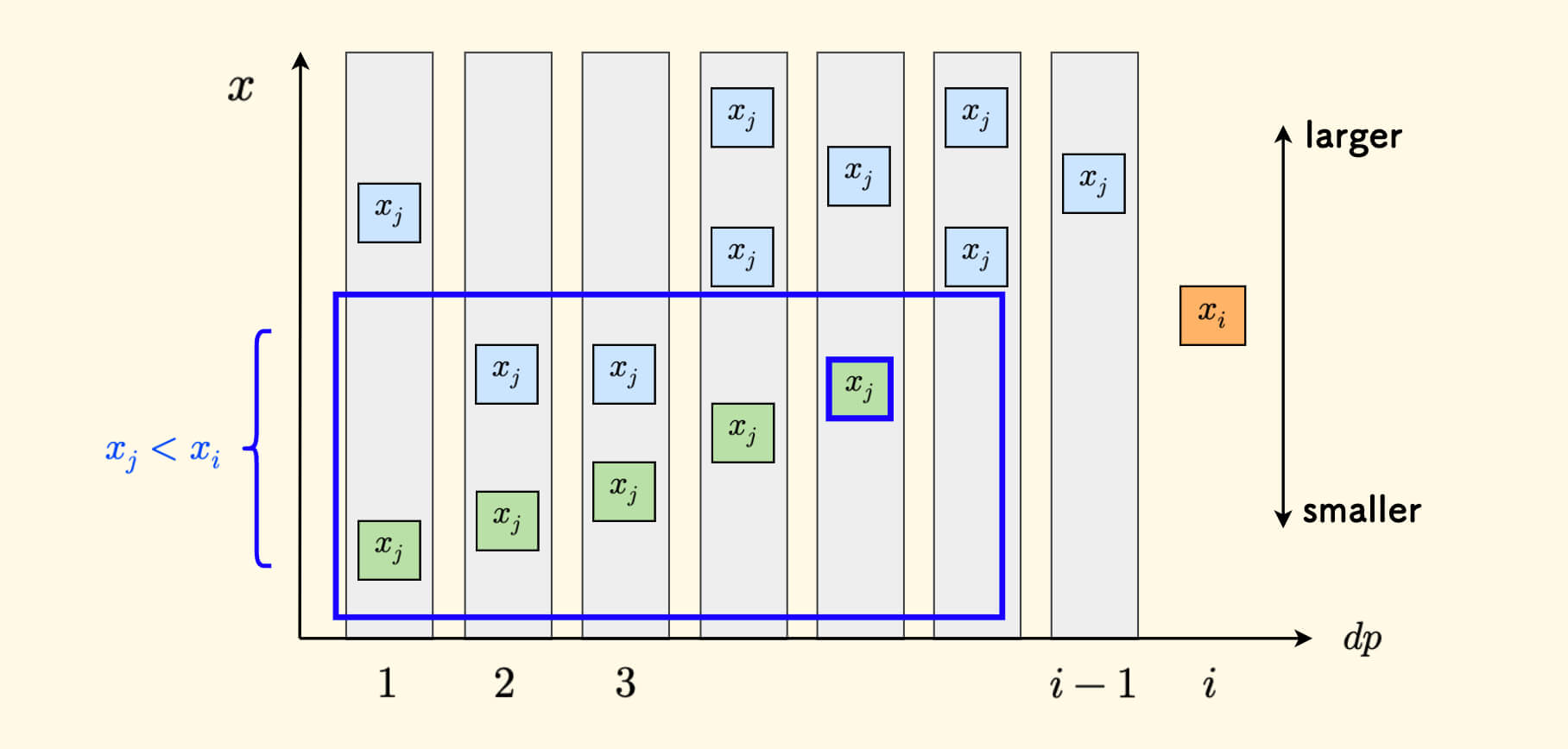 \[dp(x_i) = \max_{j < i, x_j < x_i}{dp(x_j)} + 1\]假如把扫描过的元素的值按照其 $dp$ 值分成桶来组织的话, 如下图所示,蓝色的框中是所有小于 $x_i$ 的决策集合,其中最靠右的桶取胜。