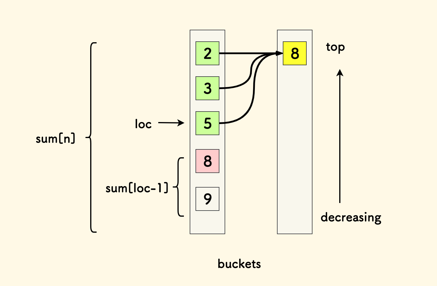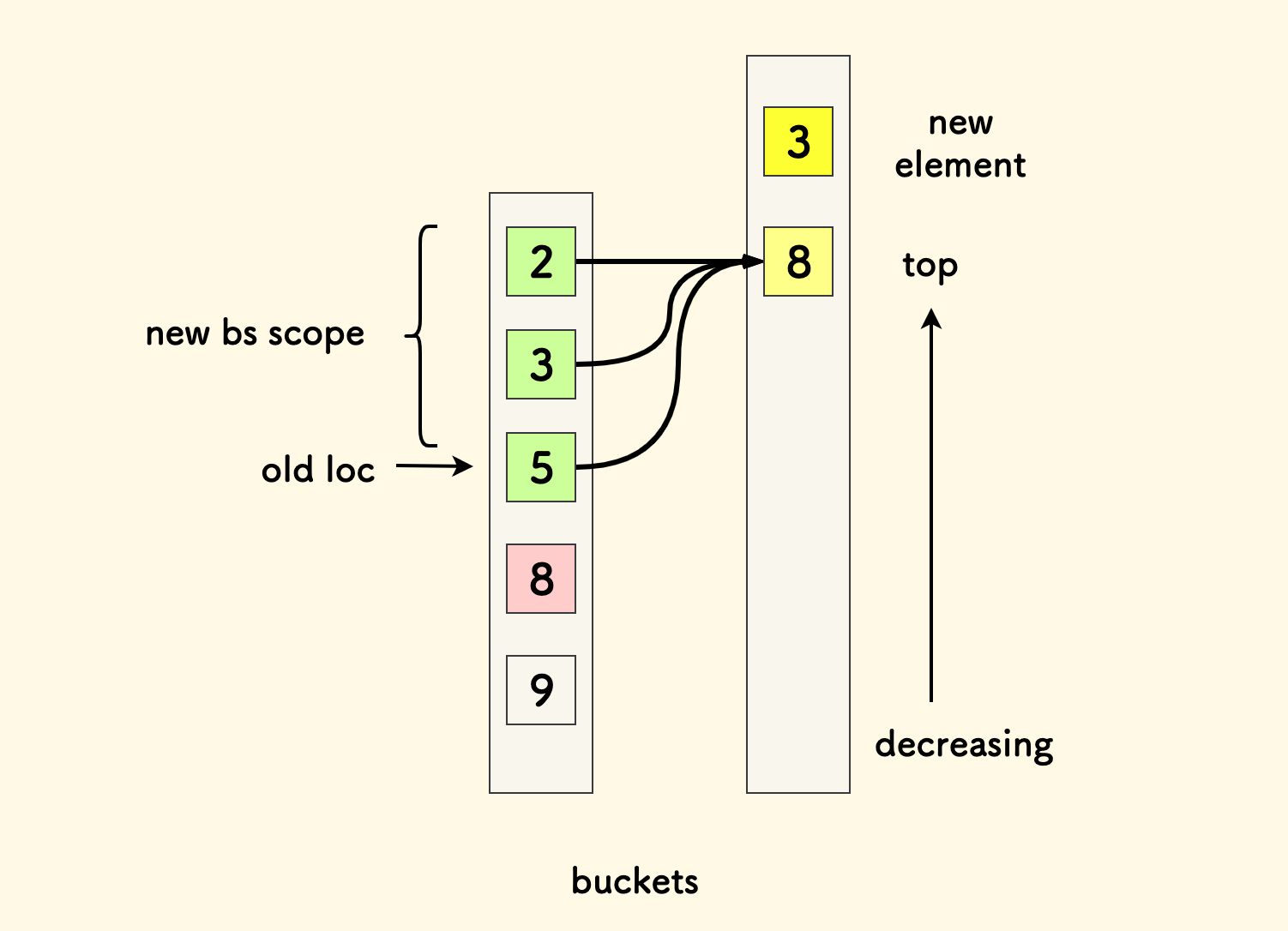 对于要输入的一个不确定的 $x_i$ 来说,可以试想让 $x_i$ 变的更大或更小的时候, 蓝色的决策集合方框的缩放情况。 可以知道,每个桶可以只由桶中的最小值来代表。