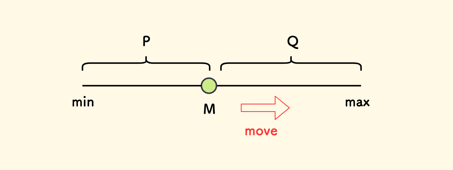 - 如果 $P < Q$,那么把 $M$ 向右移动 $1$ 个单位,那么左边的 $P$ 个元素到 $M$ 的距离之和会增大 $P$, 右边的 $Q$ 个元素到中位数的距离之和则会减少 $Q$,综合看,$S$ 总体减少 $Q - P$ 。