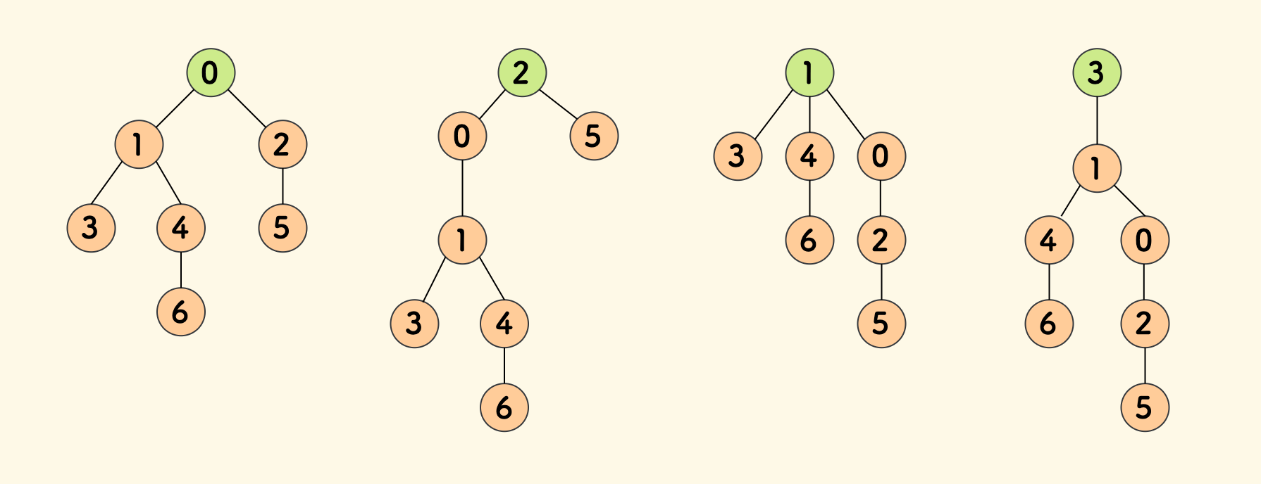 下图是一颗无向树、分别用不同节点作为根时的情况。