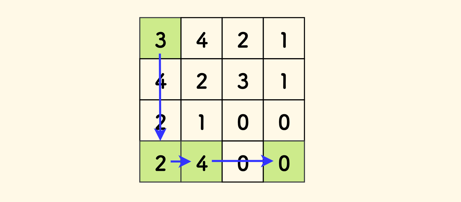 一个整数矩阵 $g$ 中,从左上角 $(0,0)$ 出发,每次可以 向右 或者 向下 移动。