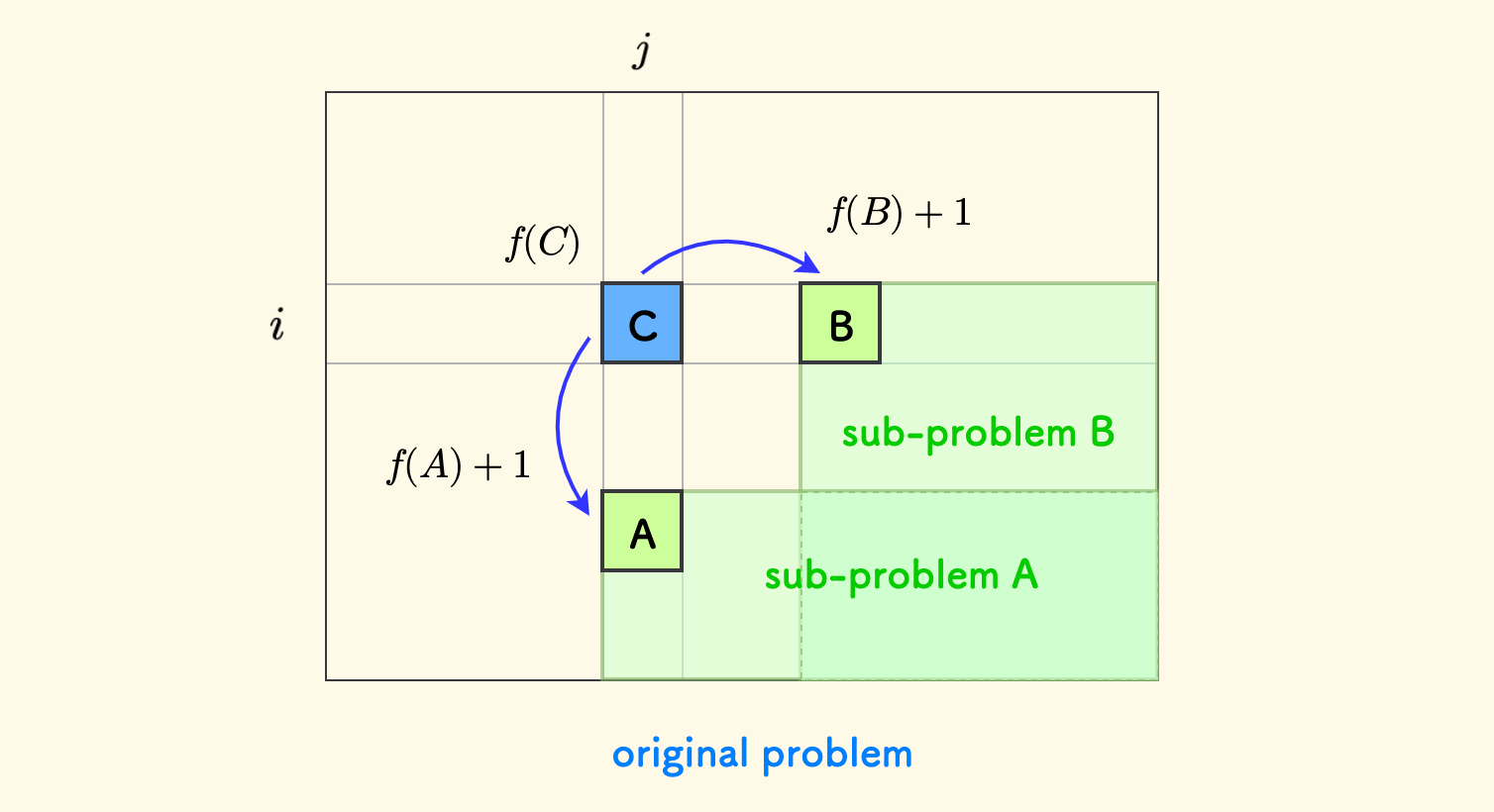 也就是说,先解决右下方的子问题,就可以推导出来左上方的更大的问题 $C$ 的答案。