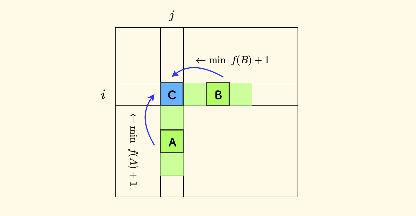 假设已经求解出来子问题 $A$ 和 $B$ 的答案,那么 $C$ 处的答案肯定是所有 $f(A)+1$ 和 $f(B)+1$ 的最小值。 因为要想到达右下角,必须经过所有的 $A$ 和 $B$ 这样的区域中的至少一个来到达,当然是挑一个移动次数最小的了。