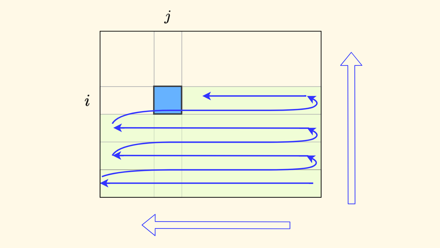 另一方面,当 $f(i,j)$ 计算完毕后,又会被利用来推导其左上方的答案。