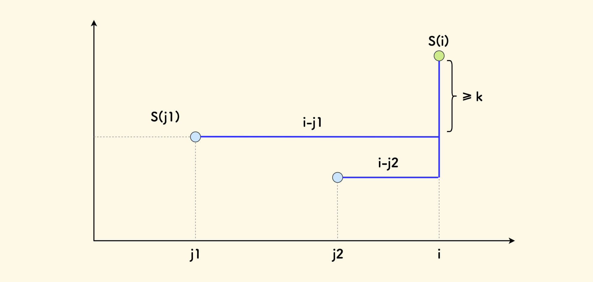 此时的 $f(i)$ 的推导可以参考下图,最优决策点 $j$ 来自蓝色的定长区间,它右侧是连续的。