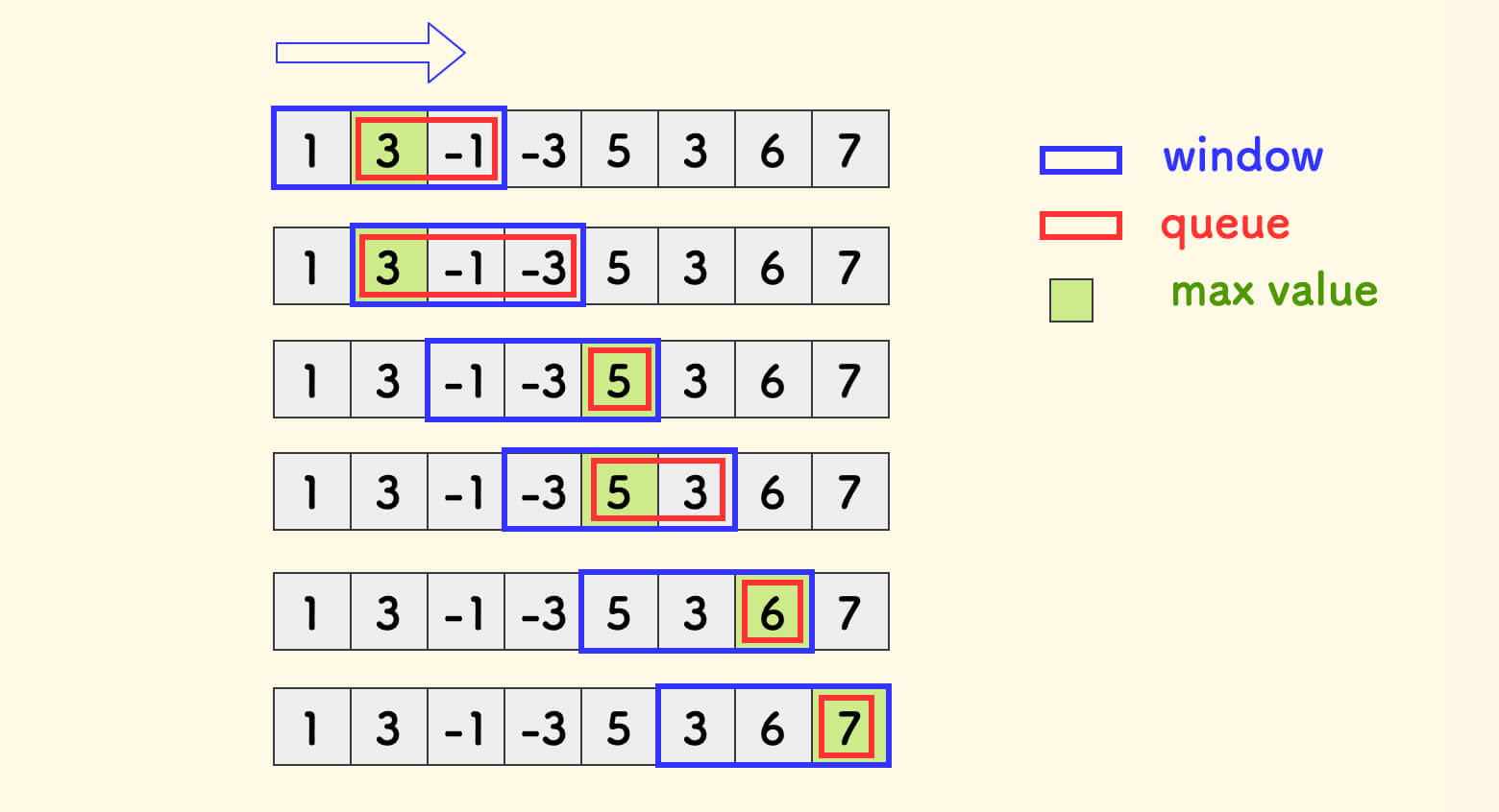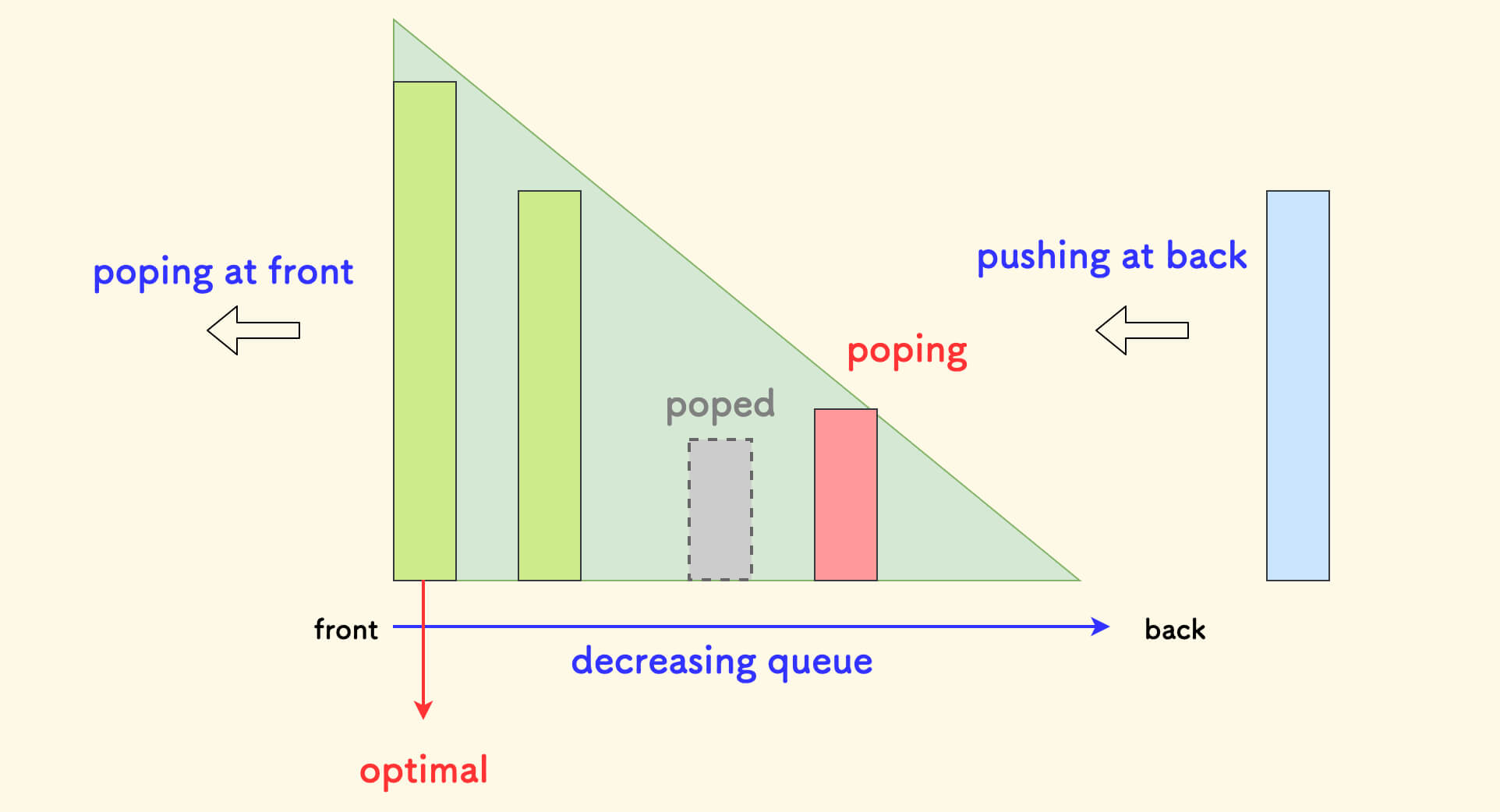 - 队尾和单调栈一样,推入新元素前,先逼迫队中不符合单调性的元素出队。