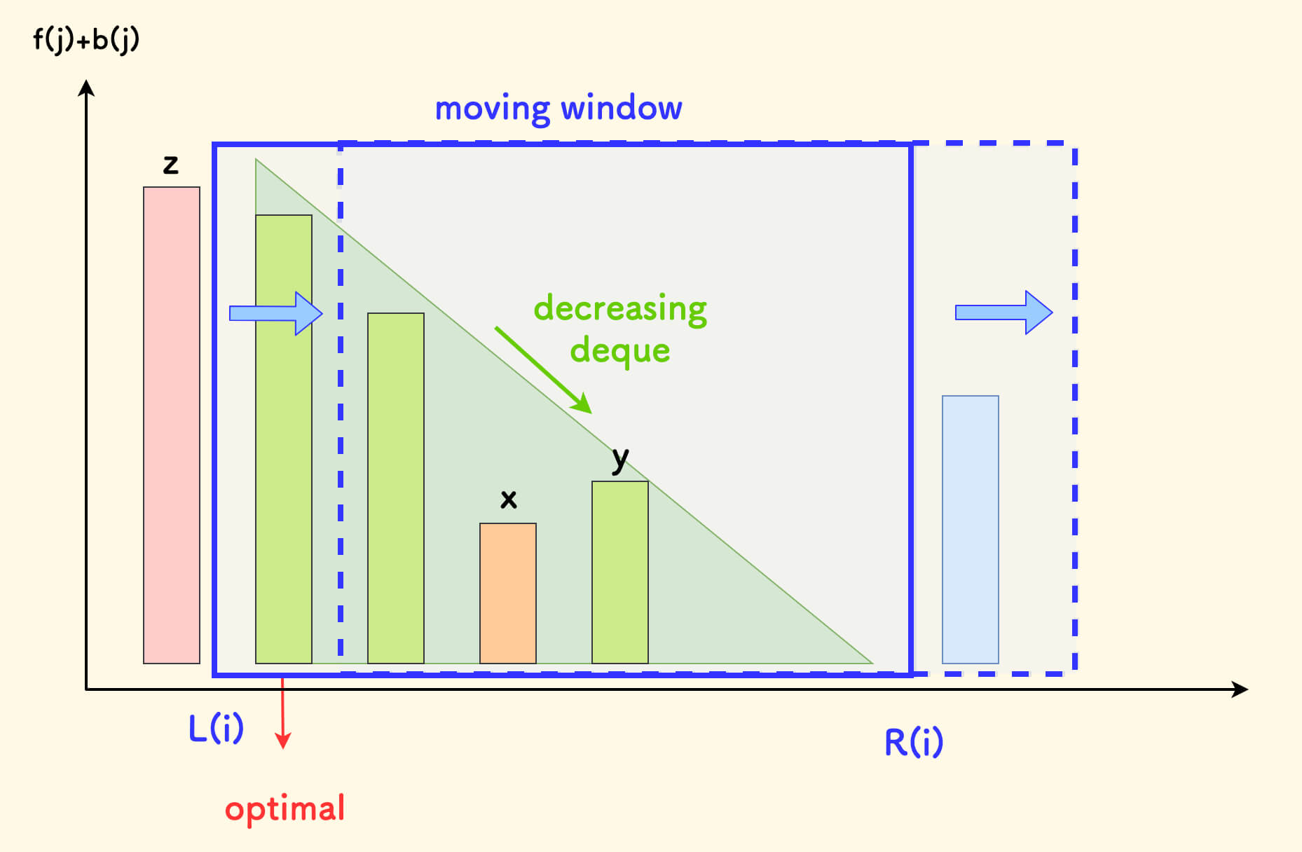 \[f(i) = \max_{L(i)\leq j\leq R(i)} { \{ f(j) + b(j) \} } + a(i)\]区间上下界均单调递增,也就是说,随着 $i$ 的增大,决策区间在右移。