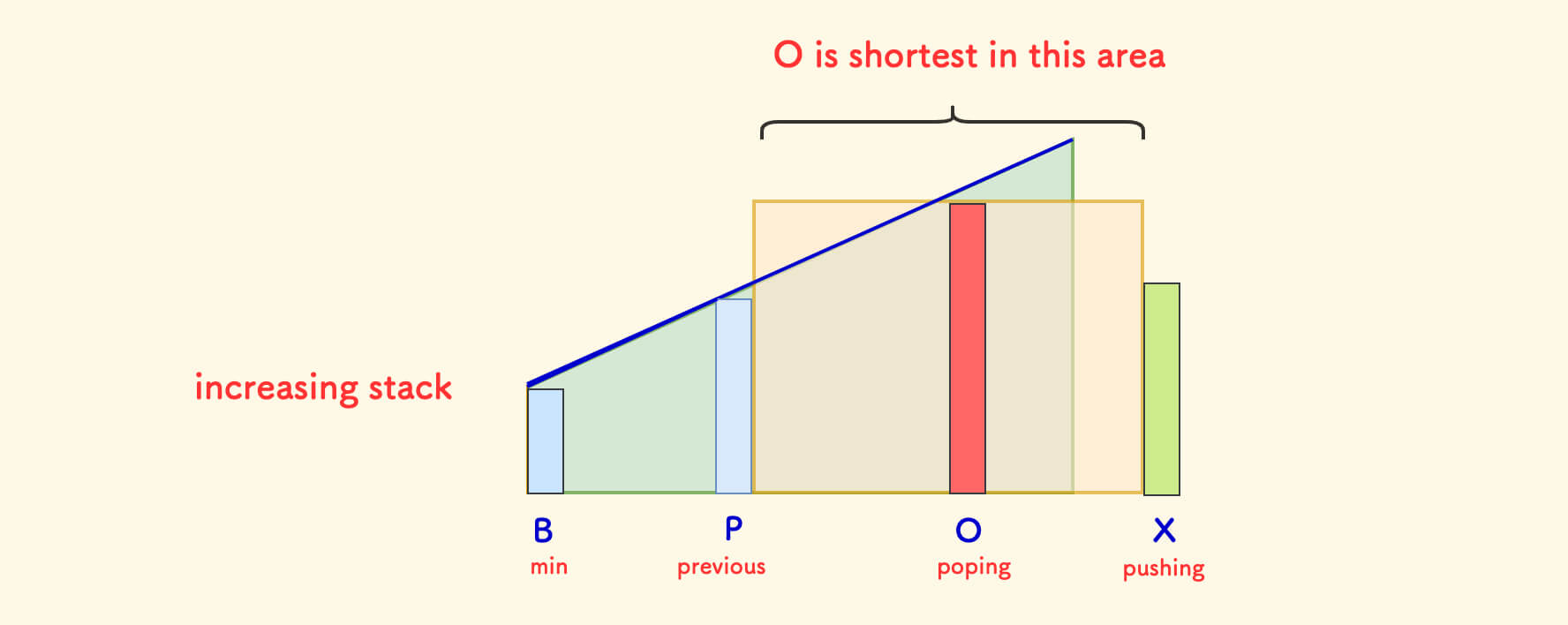 X是O的下一个更大元素.P一定大于元素O,因为是单调递减栈.- 而且