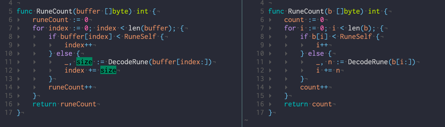 // bad counter_integer := 0 content_string := "abcdefg" Encode(dst_bytes, src_bytes []byte) Trim(str string, prefix_str string) // better counter := 0 content := "abcdefg" Encode(dst, src []byte) Trim(s, prefix string)相比而言,名字中的业务和功能信息,更为重要。