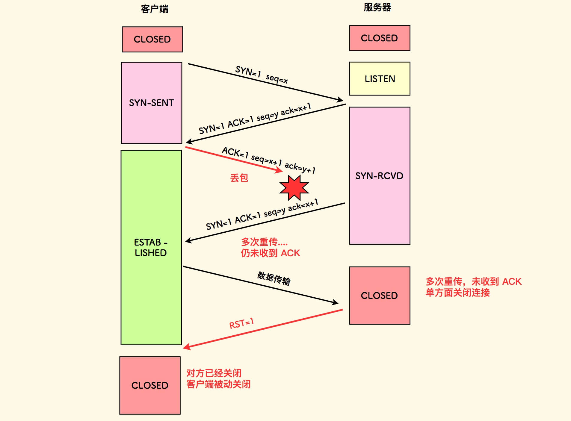 包丢失后,如果超时未收到对方确认, 就会触发重传。图 7.5 - 最后一次 ACK 丢失,会导致服务端重传 FIN 包 如果客户端在一定时间内未收到服务端的