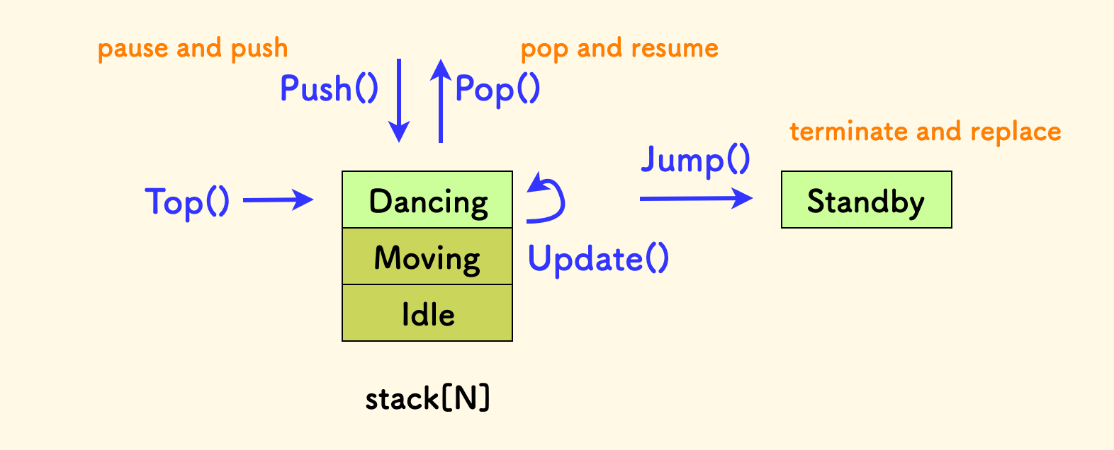 Push(ctx, RobotState::Dancing); // 下推到新状态 RobotState::Dancing