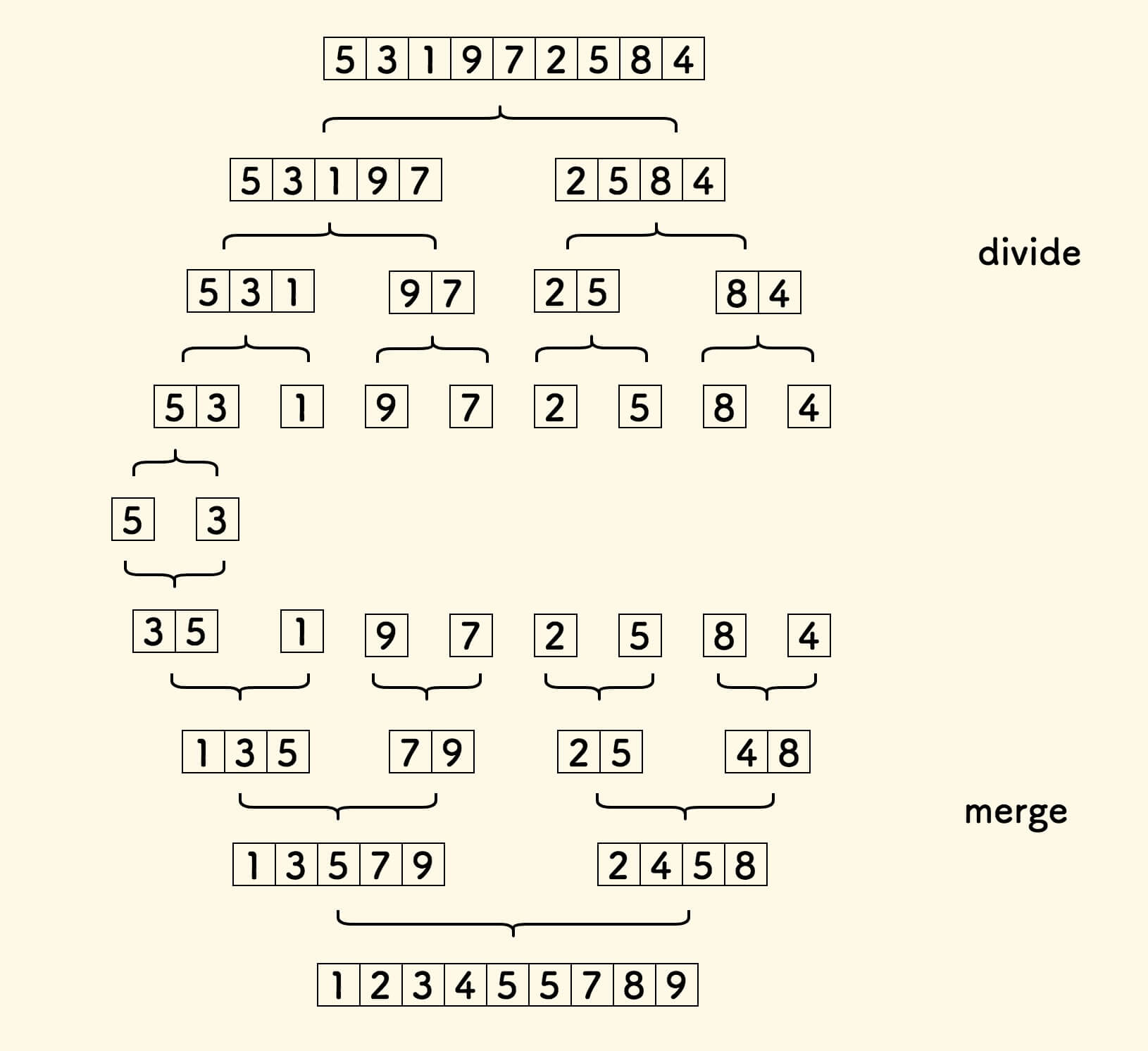 对左右两边,递归执行以上步骤,直到当前要分割的部分只有一个元素。