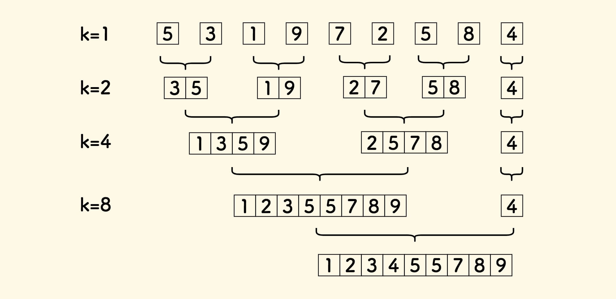 一轮归并完成后,下一次切分,此时 每个片段有 $2k$ 个元素。
