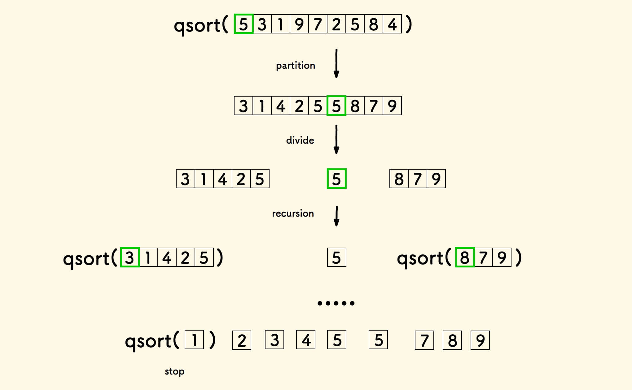 当数组原本是有序时,一直选择第一个元素作为基准的话,快排时间退化为 $O(n^2)$ 。