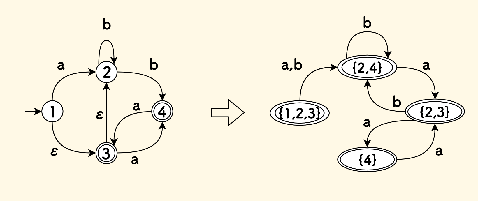 通过子集构造法,将 NFA 转化为等价的 DFA 。