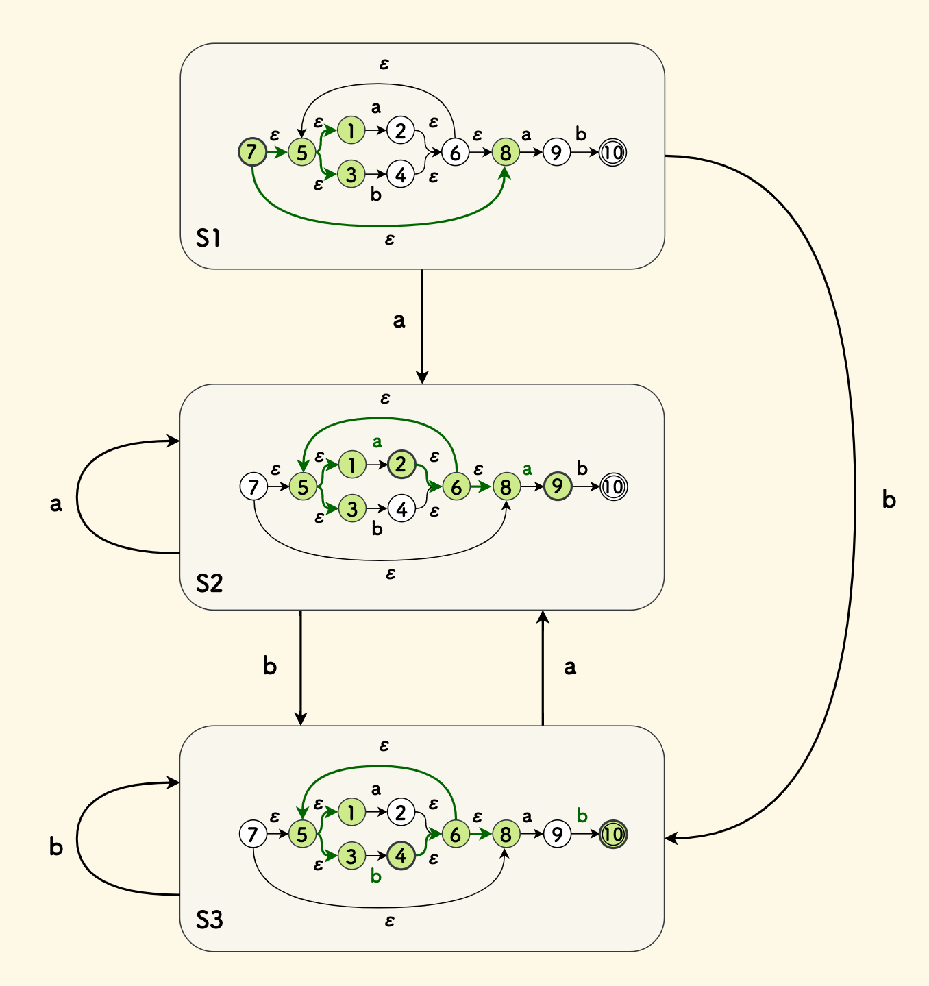 得到的 NFA 构造为 DFA 的过程如下图所示。 这个图每一步中处于同一个集合的 NfaState