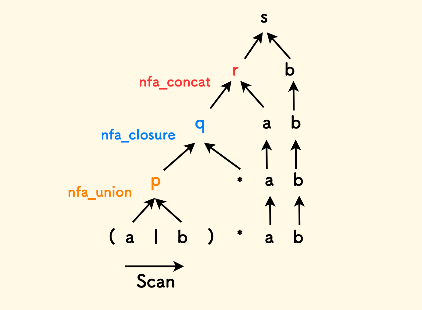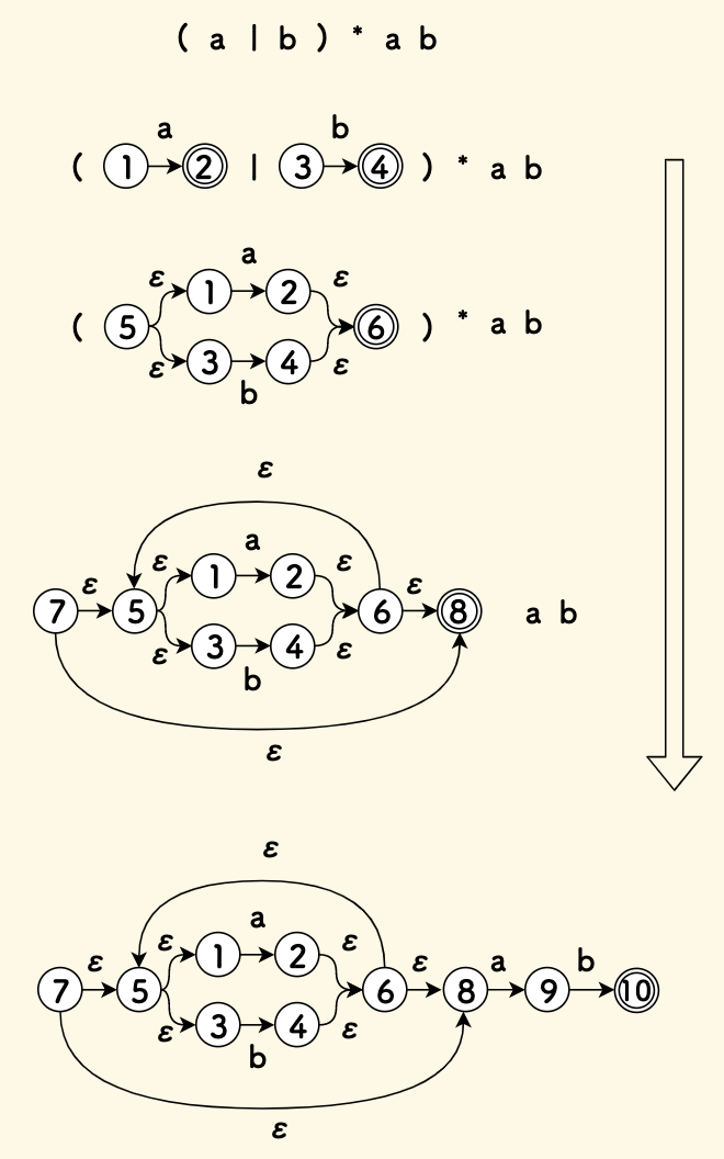 每一个正则表达式背后是一个 NFA,正则操作符都是在通过添加空边来组合和变形这些 NFA。