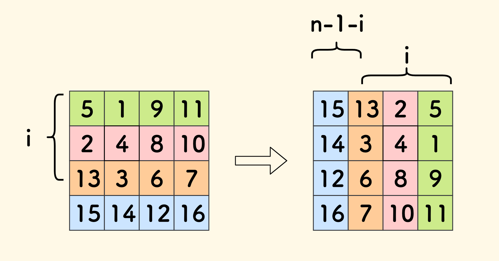 i行,在旋转后变成了从右向左的第i列,也就是从左向右的第n-1-i列。