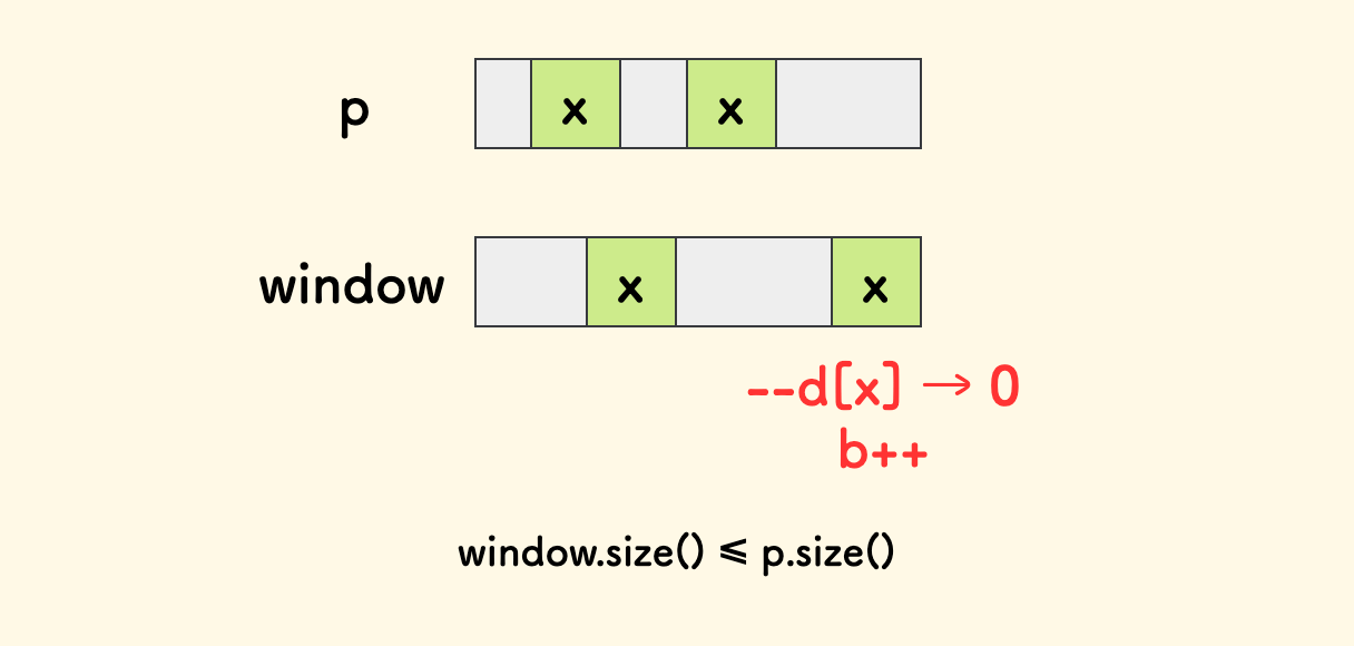 采用一个哈希表 d 来维护滑窗内的字符出现的频次: