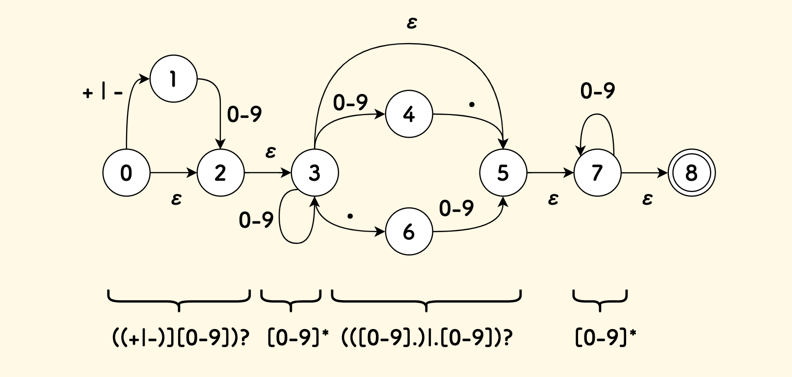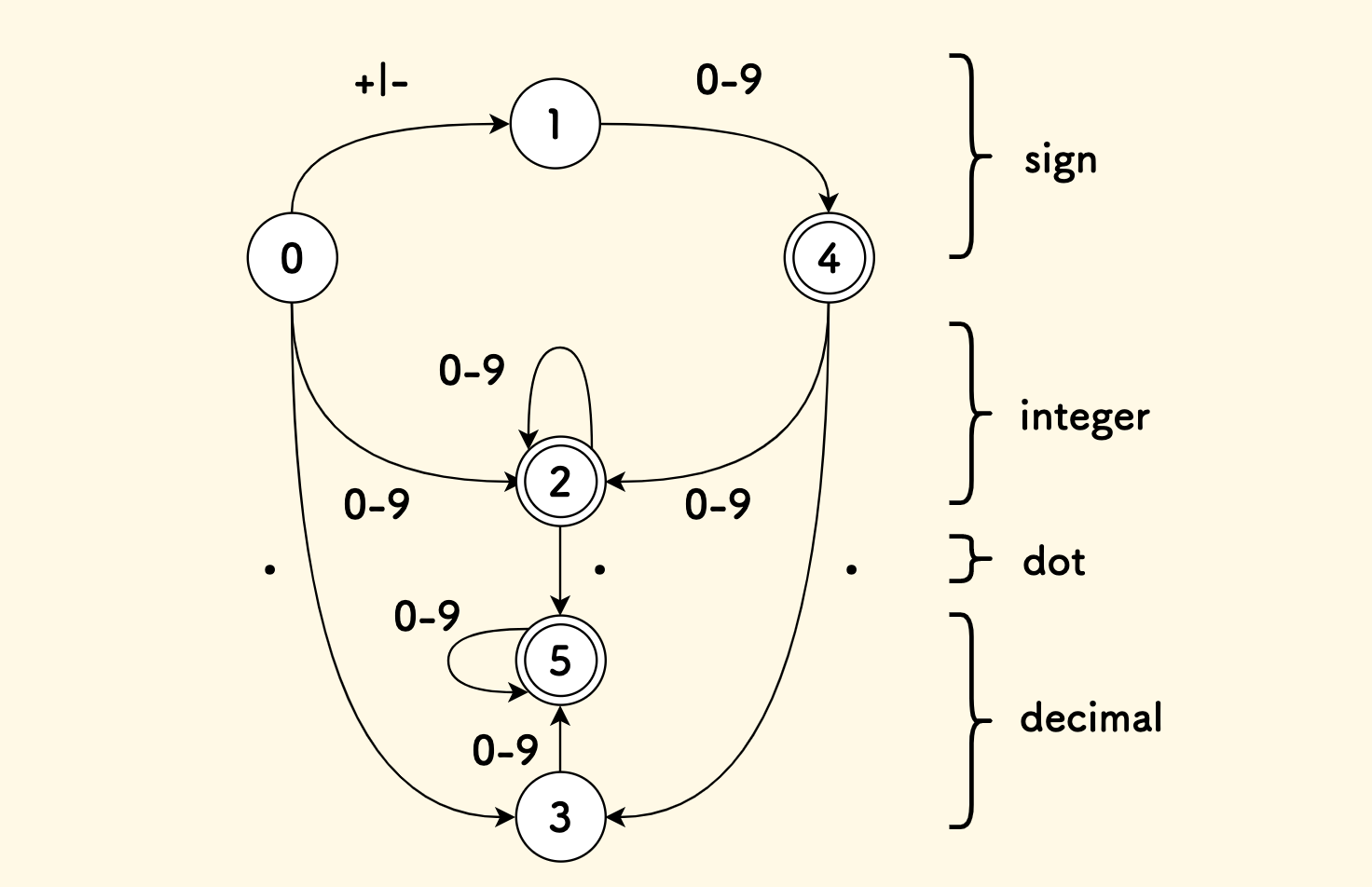 直接放出来一个匹配这种浮点数的 DFA (实际上它也是最小的):