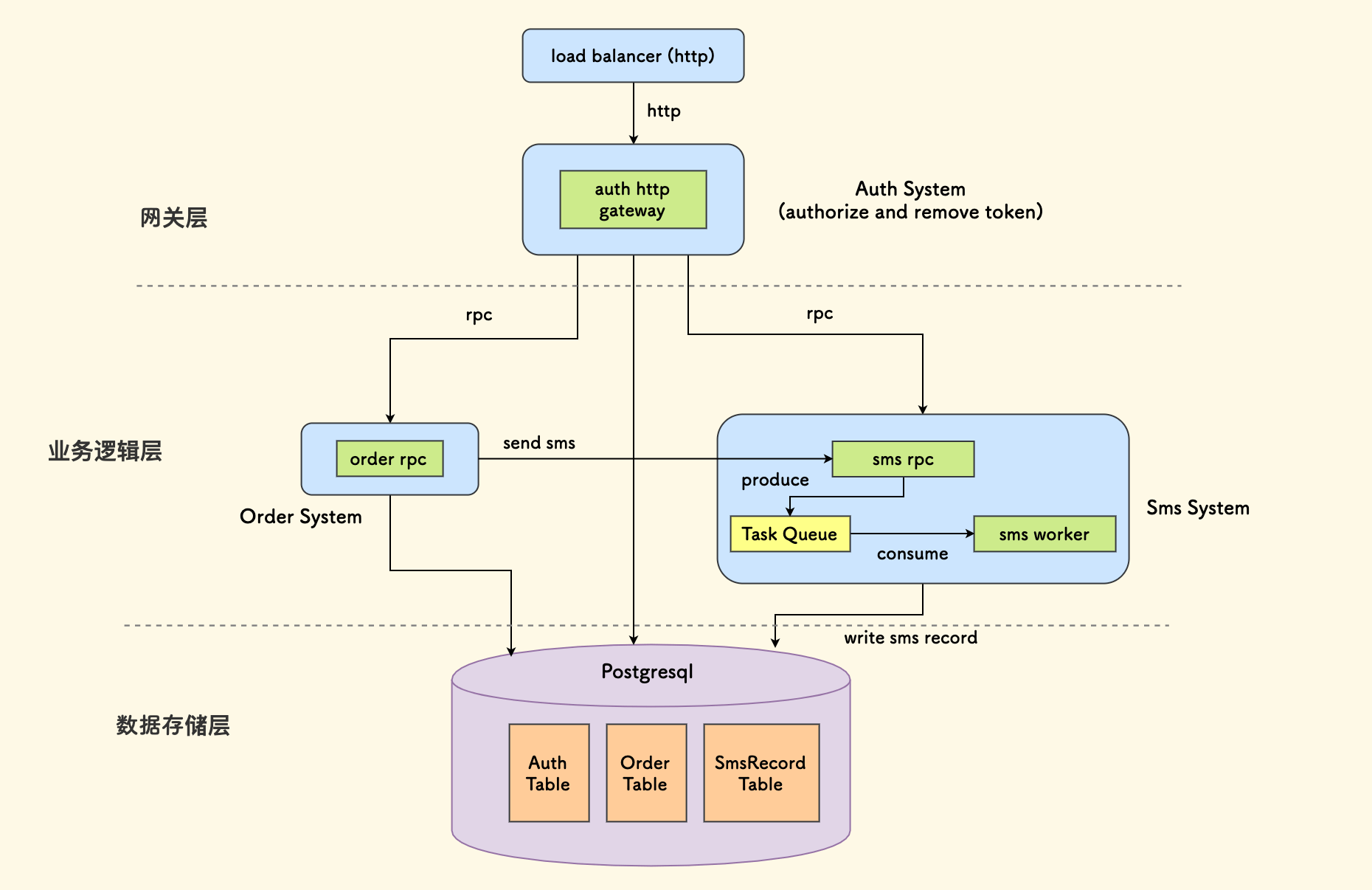 - 订单服务通过调用 sms rpc 服务来发短信、之后 sms worker 会去消费短信发送任务。
