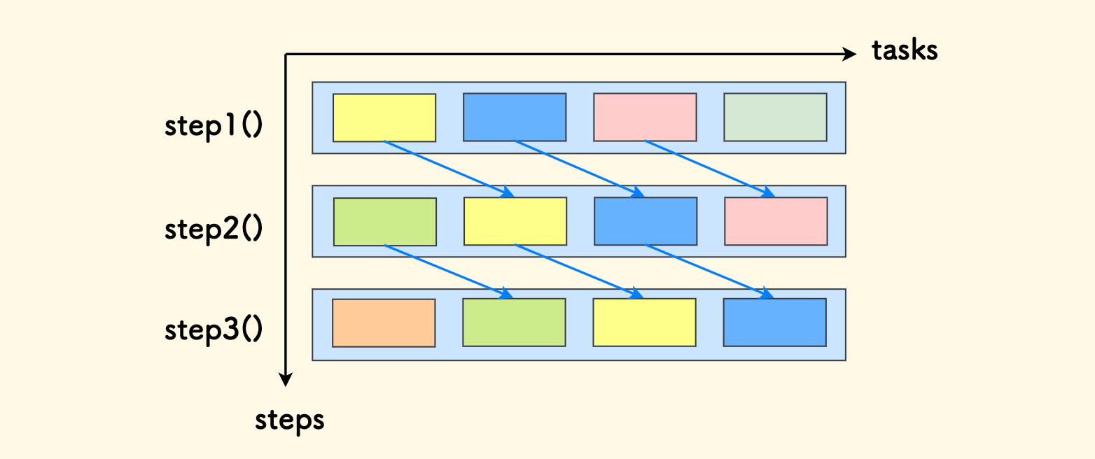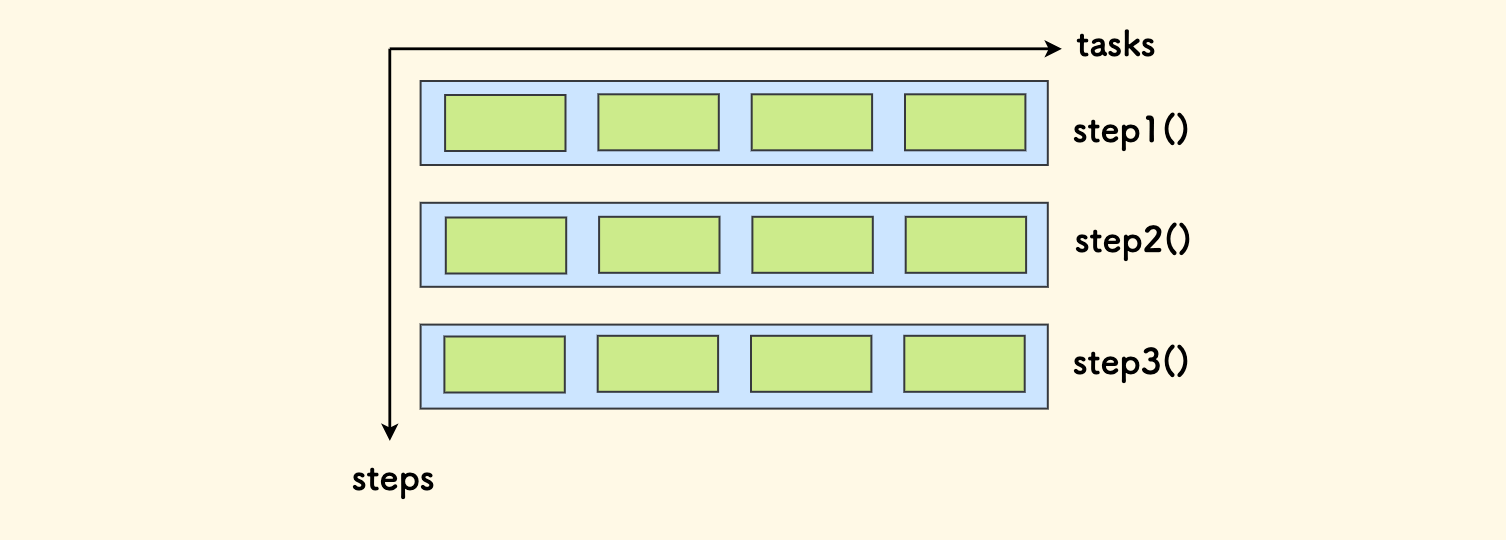 当我们要处理一批任务时,存在两个维度:任务的步骤 和 任务的规模。 下面我们把步骤作为纵向维度、规模作为横向维度,那么有两种分解方式: