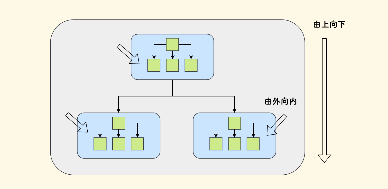 对于复杂的系统来说,应该 先做顶层设计、拆分子系统、按树状结构来做分层体系, 这样每个子系统在整体中扮演的角色才可以看的清楚。最后再逐个精细地设计各个子系统。
