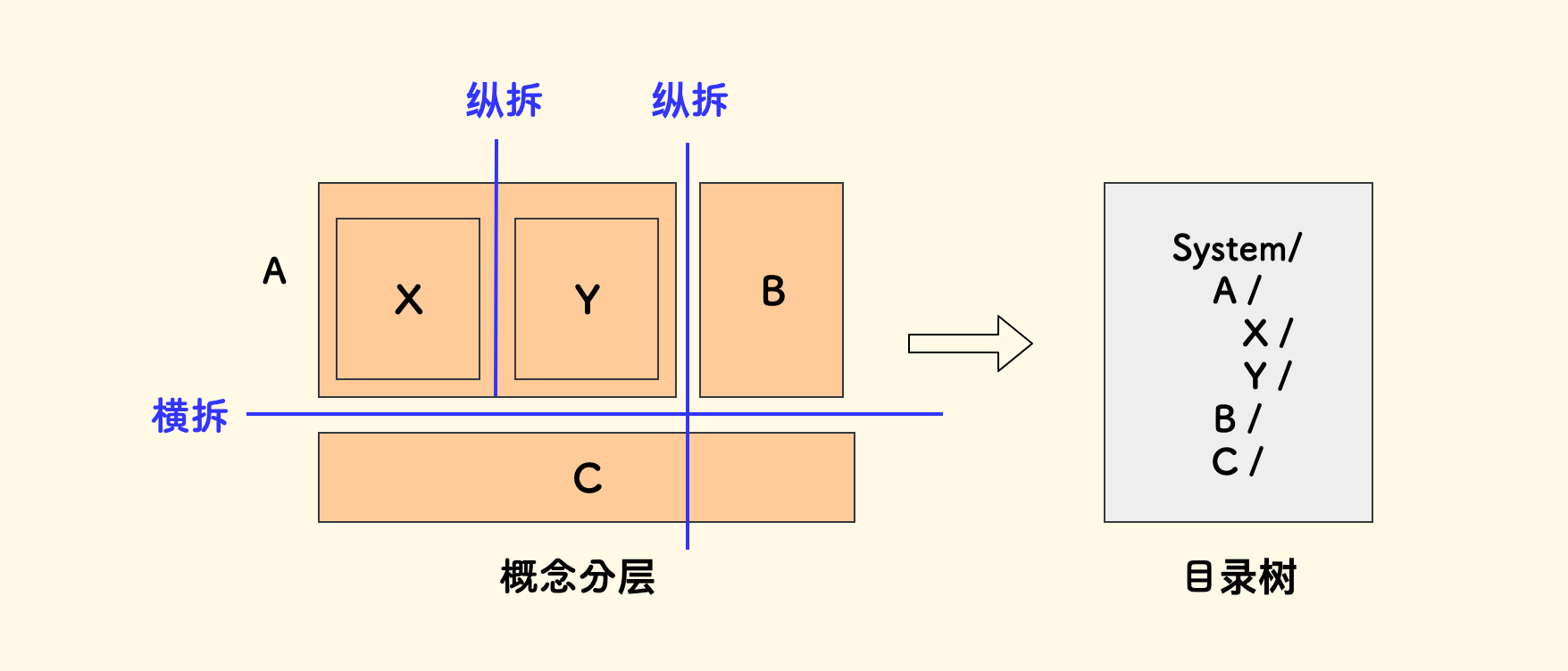 我们这里所说的模块是概念上的,不限于某种编程语言的具体模块机制、可以是 函数、类、文件、目录、子系统 等。 我通常的做法就是 划分代码目录、组织成一个目录树。 这其中存在两种划分方式,横向拆分 和 纵向拆分: