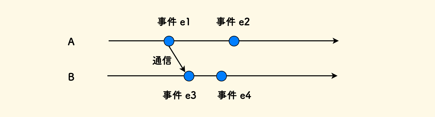 在分布式系统的模型中,进程内的事件顺序可直接由时钟确定,进程间的事件顺序则必须依靠通信。 下图中,可以确定先后顺序的有 e1 → e2