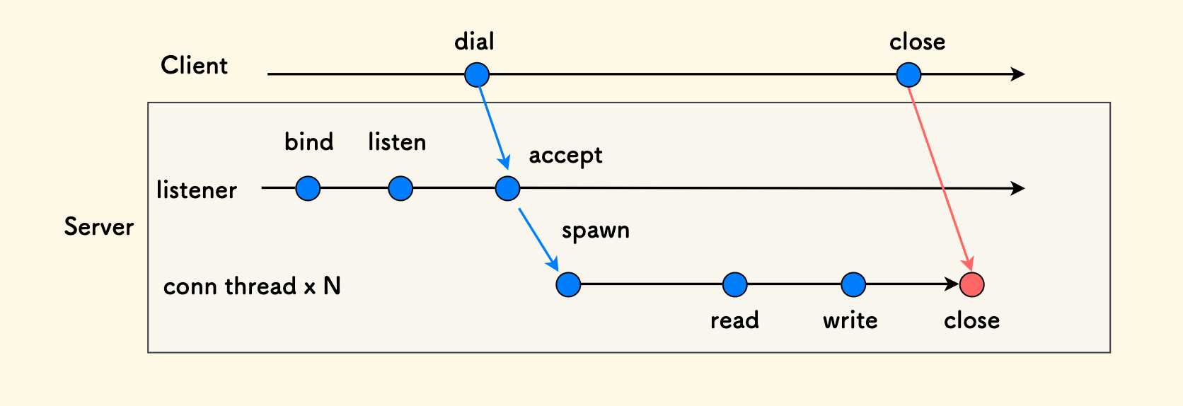 举一个时序图的例子,在一个典型的多线程实现的 TCP Server 中,主线程每建立一条新的连接,它都会创建一个子线程来负责这条连接的读写。 其时序图如下: