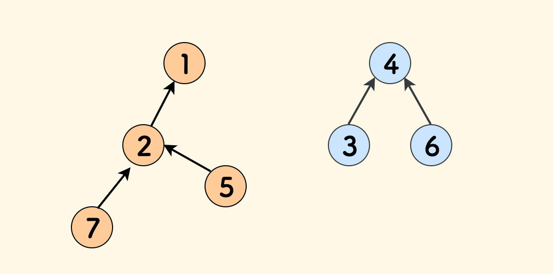 每个集合由树的根节点作为代表元,两个节点在同一个集合中(也就是连通)的话,它们的代表元(也就是根节点)是相同的。