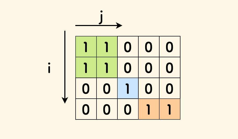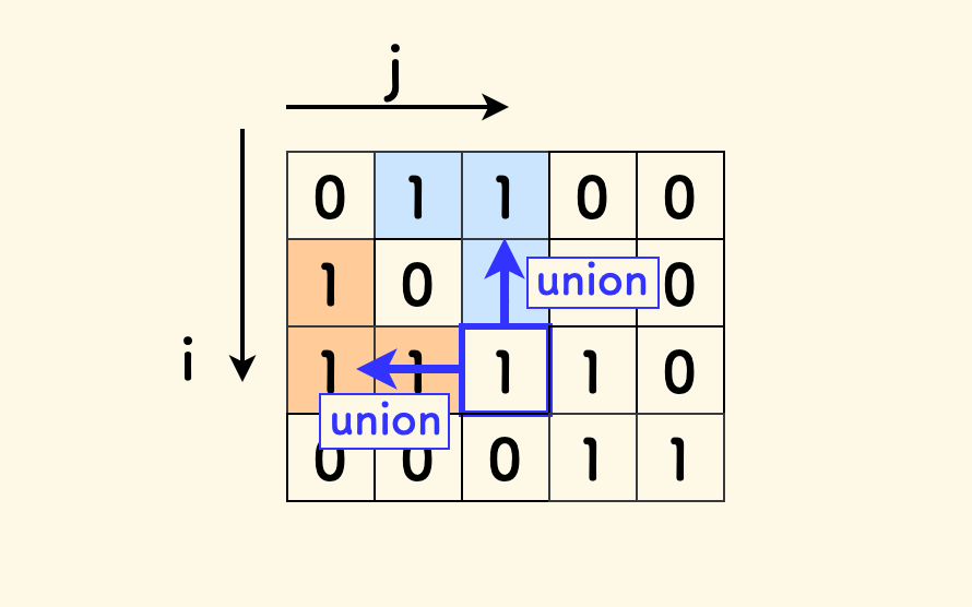 由于是自左向右、自上而下扫描,所以只需要合并 左边 和 上边 相邻的格子的集合即可。